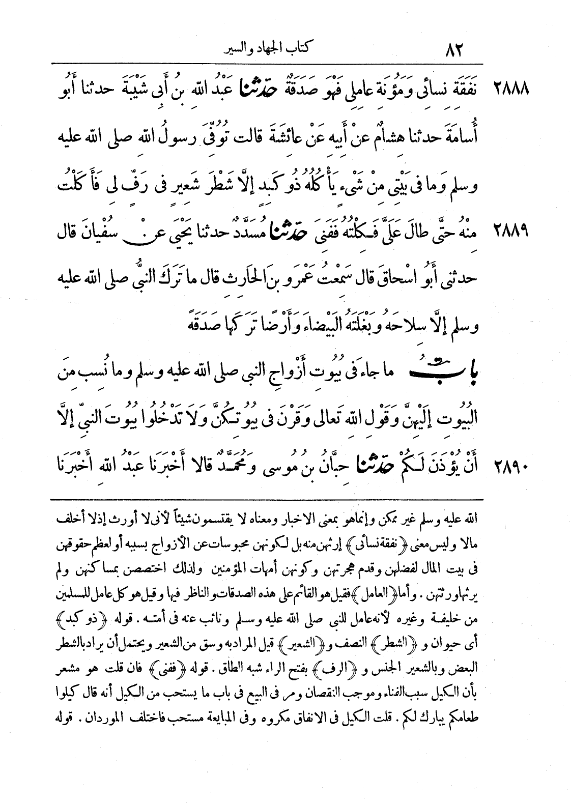 الله عليه وسلم غير ممكن وإنما هو بمعنى الأخبار ومعناه لا يقتسمون شيئًا لأني لا أورث إذ لا أخلف مالا وليس معنى (نفقة نسائي) إرثهن منه بل لكونهن محبوسات عن الأزواج بسببه أو لعظم حقوقهن في بيت المال لفضلهن وقدم هجرتهن وكونهن أمهات المؤمنين ولذلك اختصصن بمساكنهن ولم يرثها ورثتهن، وأما (العامل) فقيل هو القائم على هذه الصدقات والناظر فيها وقيل هو كل عامل للمسلمين من خليفة وغيره لأنه عامل للنبي صلى الله عليه وسلم ونائب عنه في أمته. قوله (ذو كبد) أي حيوان و (الشطر) النصف و (الشعير) قيل المراد به وسق من الشعير ويحتمل أن يراد بالشطر البعض وبالشعير الجنس و (الرف) بفتح الراء شبه الطاق، قوله (ففني) فإن قلت هو مشعر بأن الكيل سبب الفناء وموجب النقصان ومر في البيع في باب ما يستحب من الكيل أنه قال كيلوا طعامكم يبارك لكم، قلت الكيل في الإنفاق مكروه وفي المبايعة مستحب فاختلف الموردان. قوله