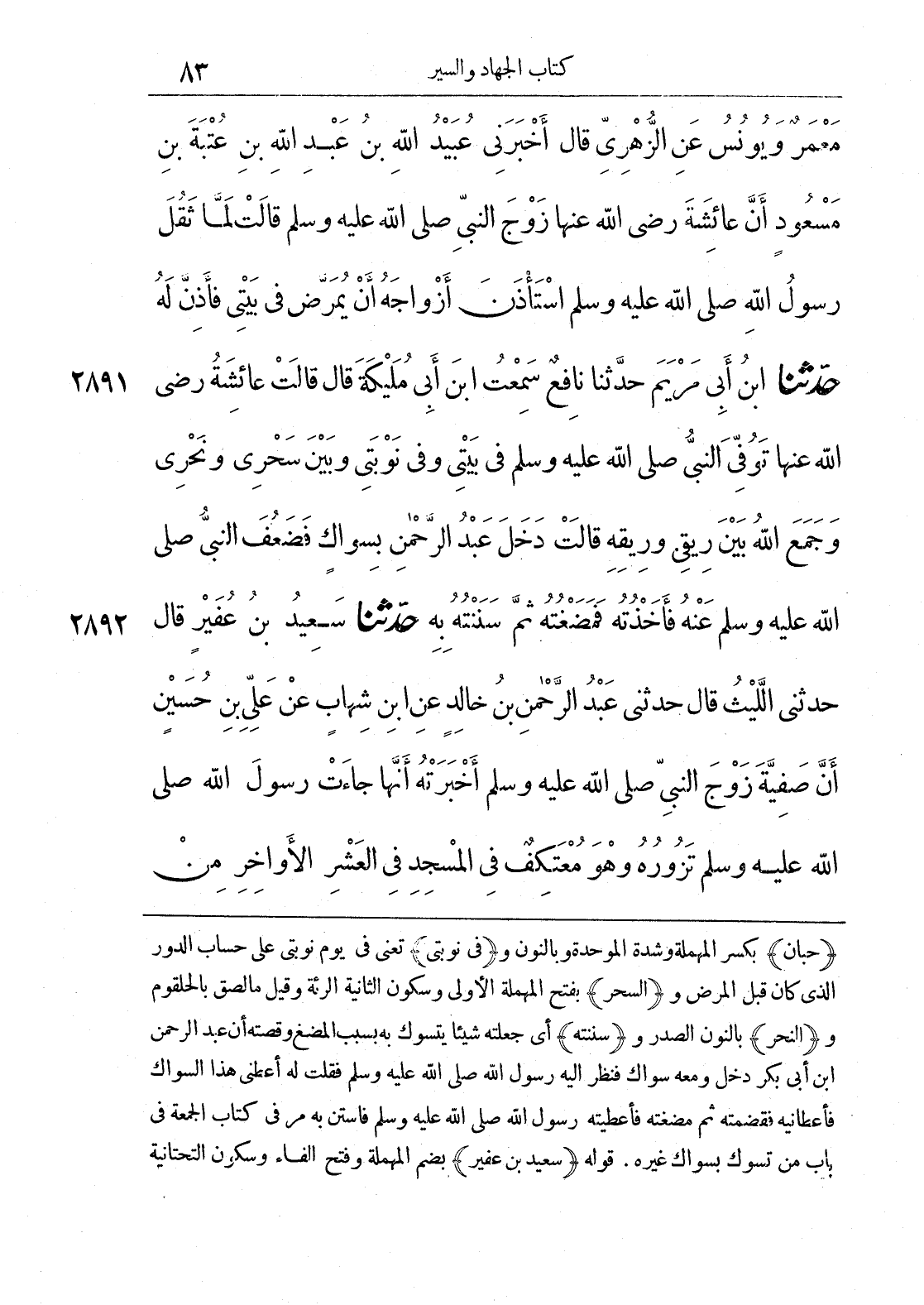 2892 - حَدَّثَنَا سَعِيدُ بْنُ عُفَيْرٍ قَالَ حَدَّثَنِي اللَّيْثُ قَالَ حَدَّثَنِي عَبْدُ الرَّحْمَنِ بْنُ خَالِدٍ عَنْ ابْنِ شِهَابٍ عَنْ عَلِيِّ بْنِ حُسَيْنٍ أَنَّ صَفِيَّةَ زَوْجَ النَّبِيِّ صَلَّى اللَّهُ عَلَيْهِ وَسَلَّمَ أَخْبَرَتْهُ أَنَّهَا جَاءَتْ رَسُولَ اللَّهِ صَلَّى اللَّهُ عَلَيْهِ وَسَلَّمَ تَزُورُهُ وَهُوَ مُعْتَكِفٌ فِي الْمَسْجِدِ فِي الْعَشْرِ الْأَوَاخِرِ مِنْ