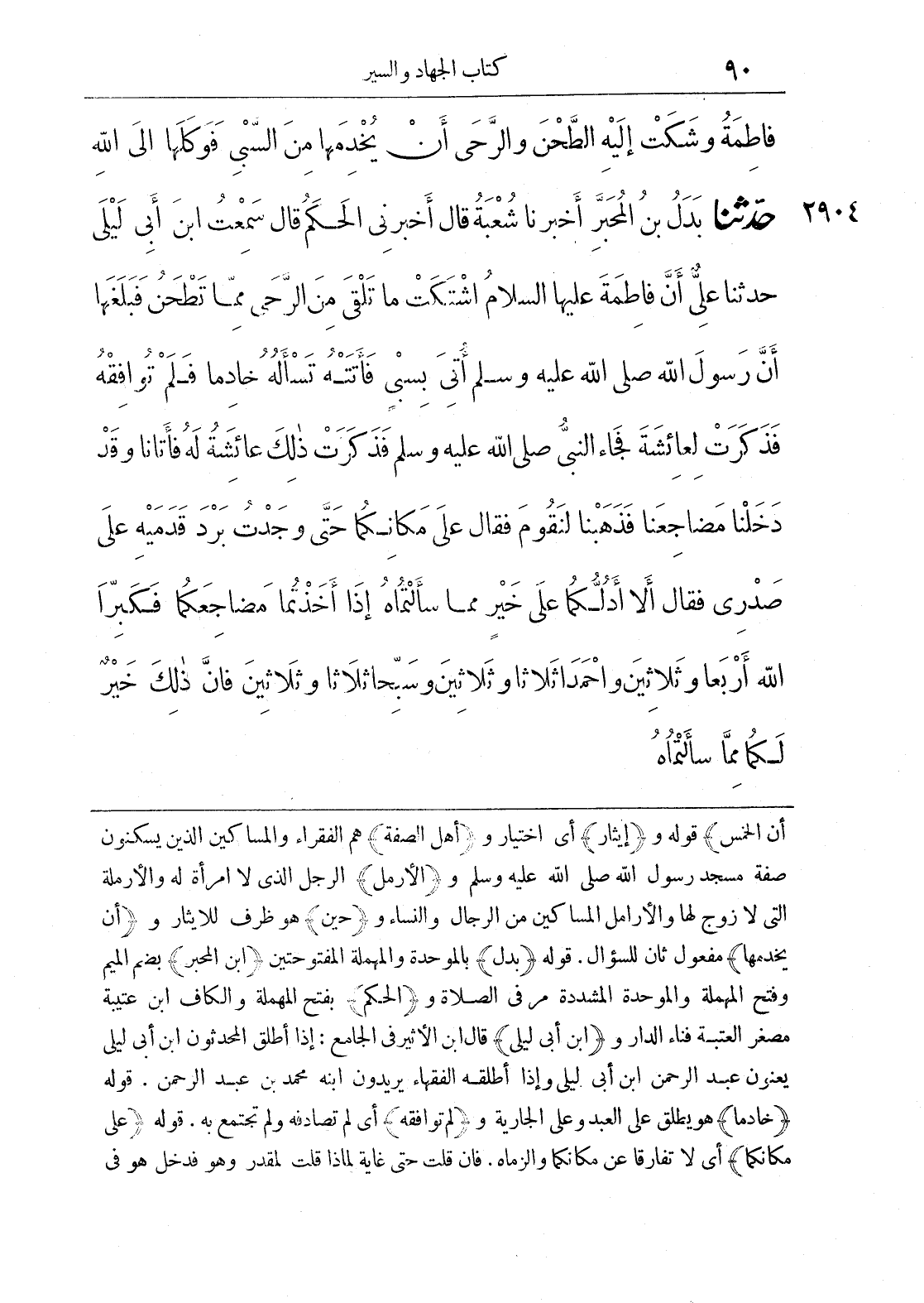 2904 - حَدَّثَنَا بَدَلُ بْنُ الْمُحَبَّرِ أَخْبَرَنَا شُعْبَةُ قَالَ أَخْبَرَنِي الْحَكَمُ قَالَ سَمِعْتُ ابْنَ أَبِي لَيْلَى حَدَّثَنَا عَلِيٌّ أَنَّ فَاطِمَةَ عَلَيْهَا السَّلَام اشْتَكَتْ مَا تَلْقَى مِنْ الرَّحَى مِمَّا تَطْحَنُ فَبَلَغَهَا أَنَّ رَسُولَ اللَّهِ صَلَّى اللَّهُ عَلَيْهِ وَسَلَّمَ أُتِيَ بِسَبْيٍ فَأَتَتْهُ تَسْأَلُهُ خَادِمًا فَلَمْ تُوَافِقْهُ فَذَكَرَتْ لِعَائِشَةَ فَجَاءَ النَّبِيُّ صَلَّى اللَّهُ عَلَيْهِ وَسَلَّمَ فَذَكَرَتْ ذَلِكَ عَائِشَةُ لَهُ فَأَتَانَا وَقَدْ دَخَلْنَا مَضَاجِعَنَا فَذَهَبْنَا لِنَقُومَ فَقَالَ عَلَى مَكَانِكُمَا حَتَّى وَجَدْتُ بَرْدَ قَدَمَيْهِ عَلَى صَدْرِي فَقَالَ أَلَا أَدُلُّكُمَا عَلَى خَيْرٍ مِمَّا سَأَلْتُمَاهُ إِذَا أَخَذْتُمَا مَضَاجِعَكُمَا فَكَبِّرَا اللَّهَ أَرْبَعًا وَثَلَاثِينَ وَاحْمَدَا ثَلَاثًا وَثَلَاثِينَ وَسَبِّحَا ثَلَاثًا وَثَلَاثِينَ فَإِنَّ ذَلِكَ خَيْرٌ لَكُمَا مِمَّا سَأَلْتُمَاهُ