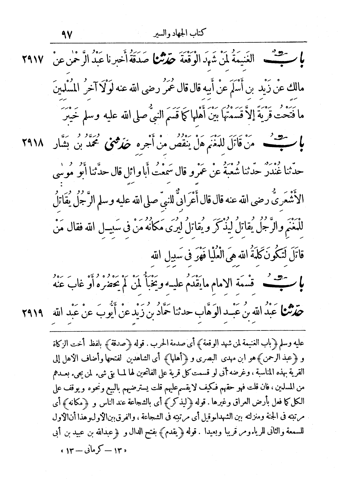 عليه وسلم (باب الغنيمة لمن شهد الوقعة) أي صدمة الحرب. قوله (صدقة) بلفظ أخت الزكاة و (عبد الرحمن) هو ابن مهدي البصري و (أهلها) أي الشاهدين لفتحها وأضاف الأهل إلى القرية بهذه المناسبة، وغرضه أني لو قسمت كل قرية على الفاتحين لها لما بقي شيء لمن يجيء بعدهم من المسلمين، فإن قلت فهو حقهم فكيف لا يقسم عليهم قلت يسترضيهم بالبيع ونحوه ويوقف على الكل كما فعل بأرض العراق وغيرها، قوله (ليذكر) أي بالشجاعة عبد الناس و (مكانه) أي مرتبته في الجنة ومنزلته بين الشهداء، وقيل أي مرتبته في الشجاعة، والفرق بين الأول وهذا أن الأول للسمعة والثاني للرياء ومر قريبا وبعيدا، قوله (يقدم) بفتح الدال و (عبد الله بن عبيد بن أبي