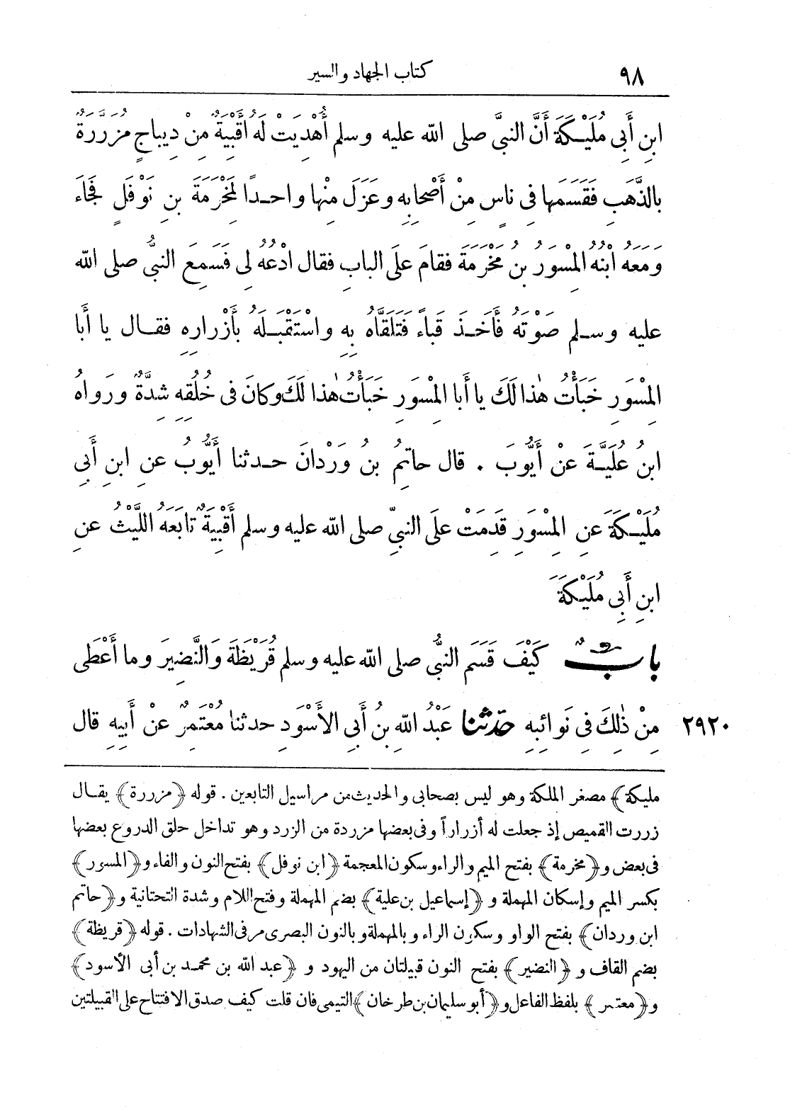 مليكة) مصغر الملكة وهو ليس بصحابي والحديث من مراسيل التابعين. قوله (مزررة) يقال زررت القميص إذ جعلت له أزرارًا وفي بعضها مزردة من الزرد وهو تداخل حلق الدروع بعضها في بعض و (مخرمة) بفتح الميم والراء وسكون المعجمة (ابن نوفل) بفتح النون والفاء و (المسور) بكسر الميم وإسكان المهملة و (إسماعيل بن علية) بضم المهملة وفتح اللام وشدة التحتانية و (حاتم بن وردان) بفتح الواو وسكون الراء وبالمهملة وبالنون البصري مر في الشهادات. قوله (قريظة) بضم القاف و (النضير) بفتح النون قبيلتان من اليهود و (عبد الله بن محمد بن أبي الأسود) و (معتمر) بلفظ الفاعل و (أبو سليمان بن طرخان) التيمي فإن قلت كيف صدق الافتتاح على القبيلتين