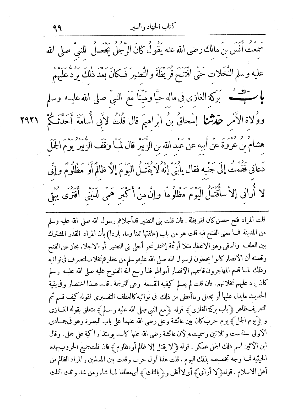 2921 - حَدَّثَنَا إِسْحَاقُ بْنُ إِبْرَاهِيمَ قَالَ قُلْتُ لِأَبِي أُسَامَةَ أَحَدَّثَكُمْ هِشَامُ بْنُ عُرْوَةَ عَنْ أَبِيهِ عَنْ عَبْدِ اللَّهِ بْنِ الزُّبَيْرِ قَالَ لَمَّا وَقَفَ الزُّبَيْرُ يَوْمَ الْجَمَلِ دَعَانِي فَقُمْتُ إِلَى جَنْبِهِ فَقَالَ يَا بُنَيِّ إِنَّهُ لَا يُقْتَلُ الْيَوْمَ إِلَّا ظَالِمٌ أَوْ مَظْلُومٌ وَإِنِّي لَا أُرَانِي إِلَّا سَأُقْتَلُ الْيَوْمَ مَظْلُومًا وَإِنَّ مِنْ أَكْبَرِ هَمِّي لَدَيْنِي أَفَتُرَى يُبْقِي