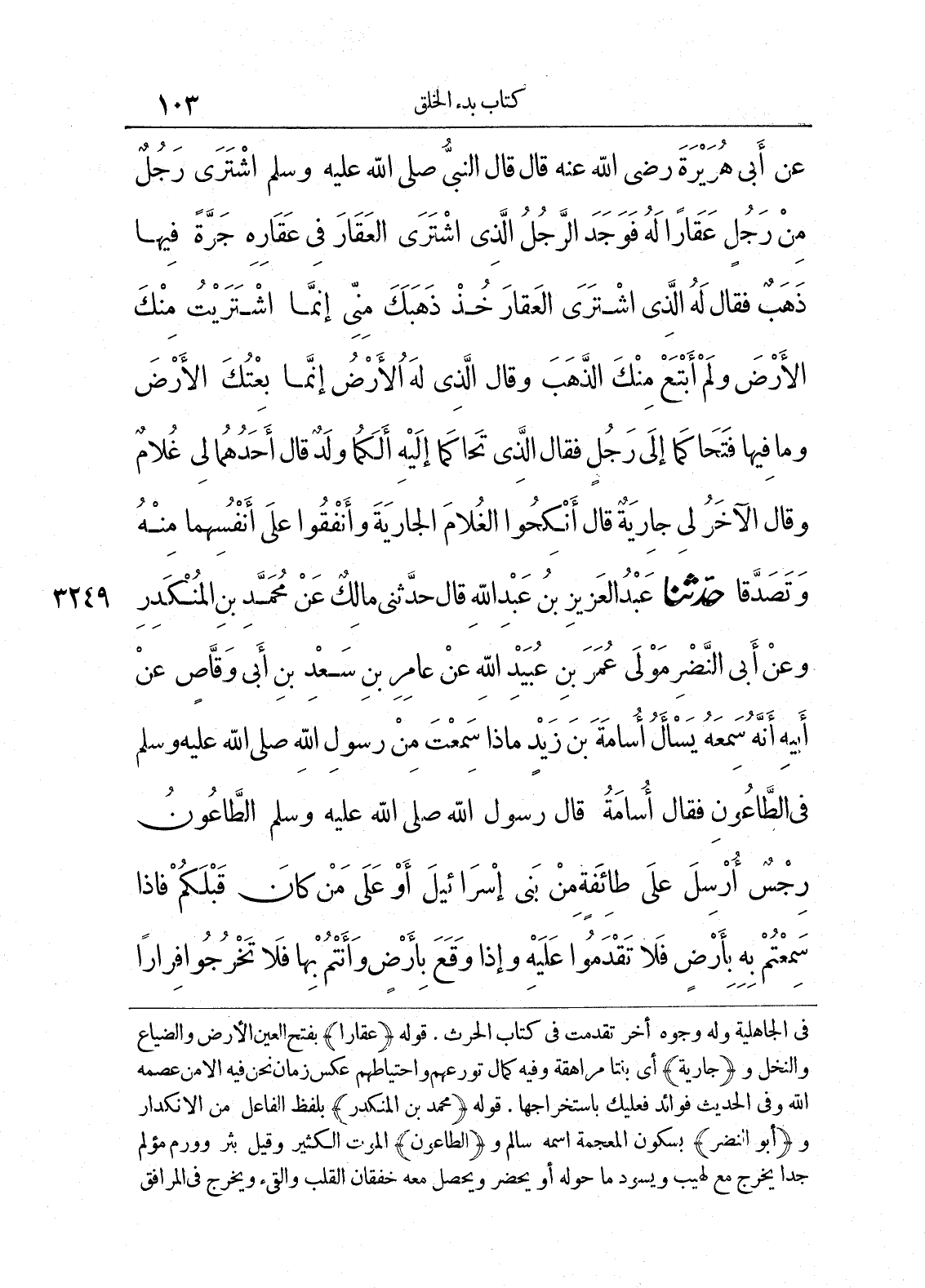 في الجاهلية وله وجوه أخر تقدمت في كتاب الحرث. قوله (عقاراً) بفتح العين الأرض والضياع والنخل و (جارية) أي بنتاً مراهقة وفيه كمال تورعهم واحتياطهم عكس زمان نحن فيه إلا من عصمه الله وفي الحديث فوائد فعليك باستخراجها. قوله (محمد بن المنكدر) بلفظ الفاعل من الانكدار و (أبو النضر) بسكون المعجمة اسمه سالم و (الطاعون) الموت الكثير وقيل بثر وورم مؤلم جداً يخرج مع لهيب ويسود ما حوله أو يحضر ويحصل معه خفقان القلب والقئ ويخرج في المرافق