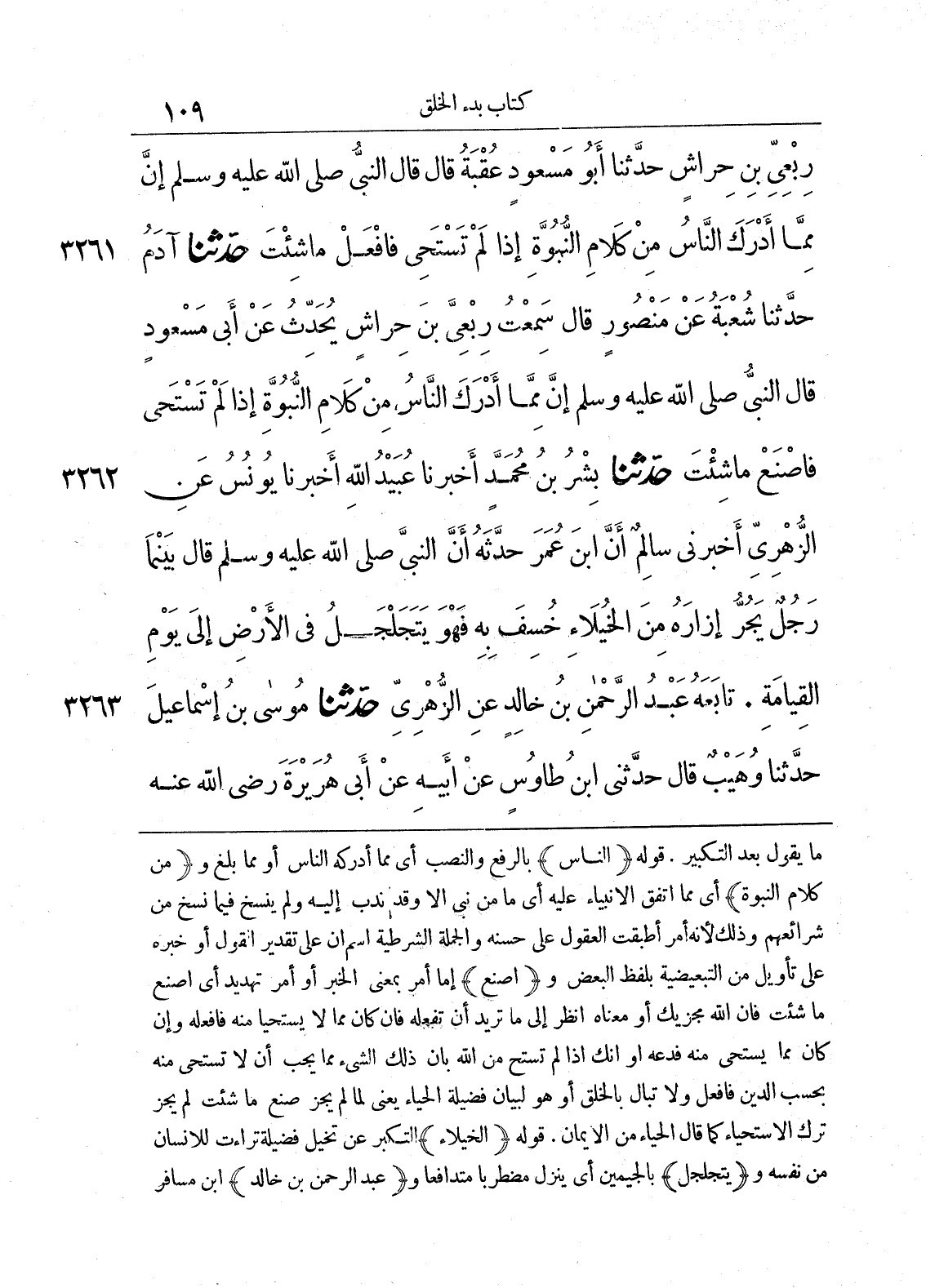 رِبْعِىِّ بْنِ حِرَاشٍ حَدَّثَنَا أَبُو مَسْعُودٍ عُقْبَةُ قَالَ قَالَ النَّبِىُّ صلى الله عليه وسلم «إِنَّ مِمَّا أَدْرَكَ النَّاسُ مِنْ كَلاَمِ النُّبُوَّةِ، إِذَا لَمْ تَسْتَحِى فَافْعَلْ مَا شِئْتَ».