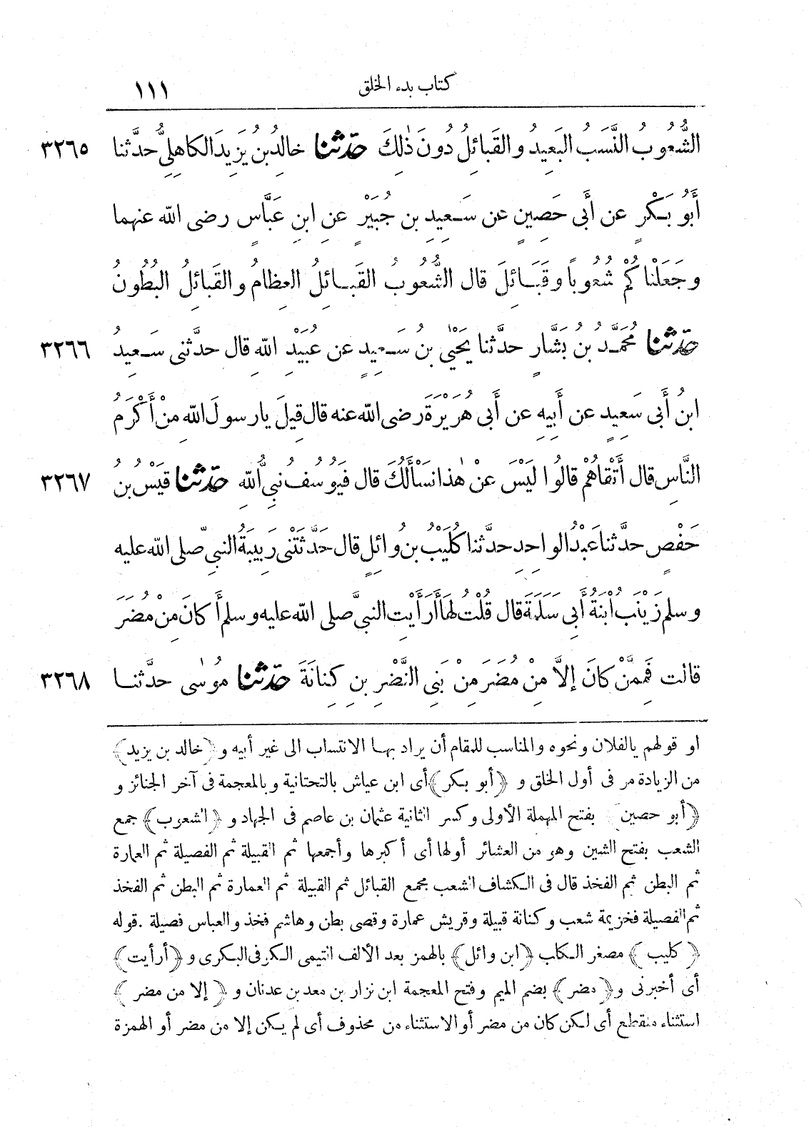 3265 - حَدَّثَنَا خَالِدُ بْنُ يَزِيدَ الْكَاهِلِىُّ حَدَّثَنَا أَبُو بَكْرٍ عَنْ أَبِى حَصِينٍ عَنْ سَعِيدِ بْنِ جُبَيْرٍ عَنِ ابْنِ عَبَّاسِ رضى الله عنهما (وَجَعَلْنَاكُمْ شُعُوباً وَقَبَائِلَ) قَالَ الشُّعُوبُ الْقَبَائِلُ الْعِظَامُ، وَالْقَبَائِلُ الْبُطُونُ.