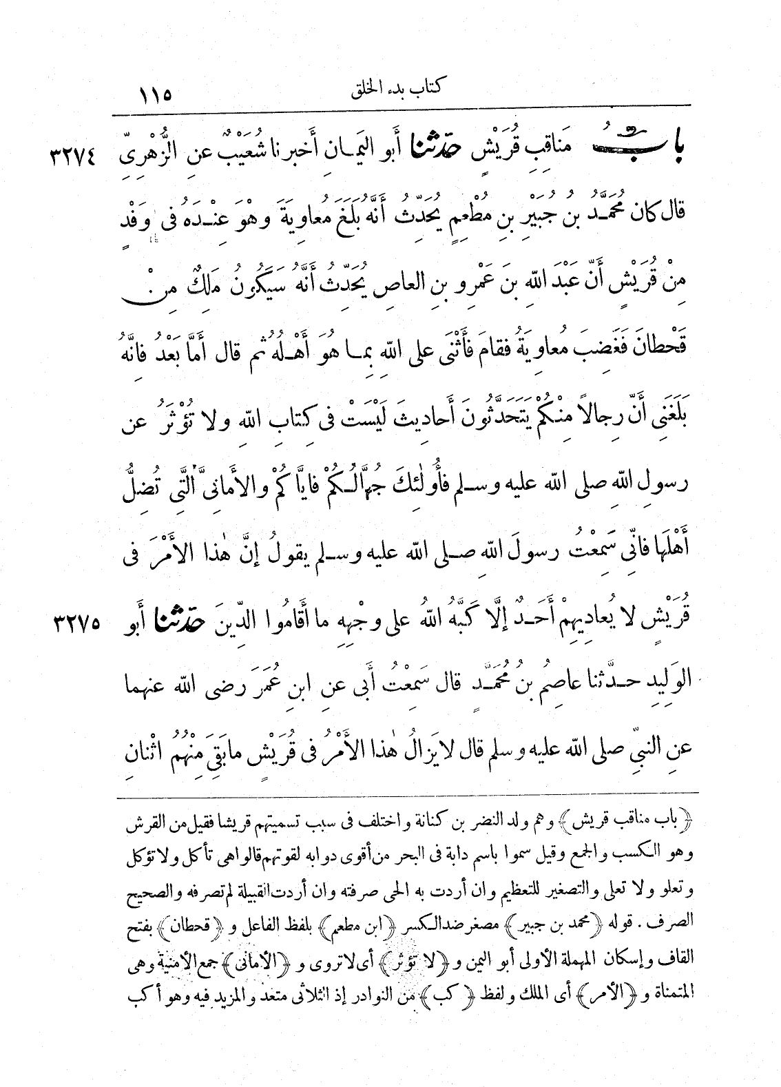 (باب مناقب قريش) وهم ولد النضر بن كنانة واختلف في سبب تسميتهم قريشاً فقيل من القرش وهو الكسب والجمع وقيل سموا باسم دابة في البحر من أقوى دوابه لقوتهم قالوا هي تأكل ولا تؤكل وتعلوا ولا تعلى والتصغير للتعظيم وإن أردت به الحي صرفته وإن أردت القبيلة لم تصرفه والصحيح الصرف. قوله (محمد بن جبير) مصغر ضد الكسر (ابن مطعم) بلفظ الفاعل و (قحطان) بفتح القاف وإسكان المهملة الأولى أبو اليمن و (لا تؤثر) أي لا تروي و (الأماني) جمع الأمنية وهي المتمناه و (الأمر) أي الملك ولفظ (كب) من النوادر إذ الثلاثي متعد والمزيد فيه وهو أكبر