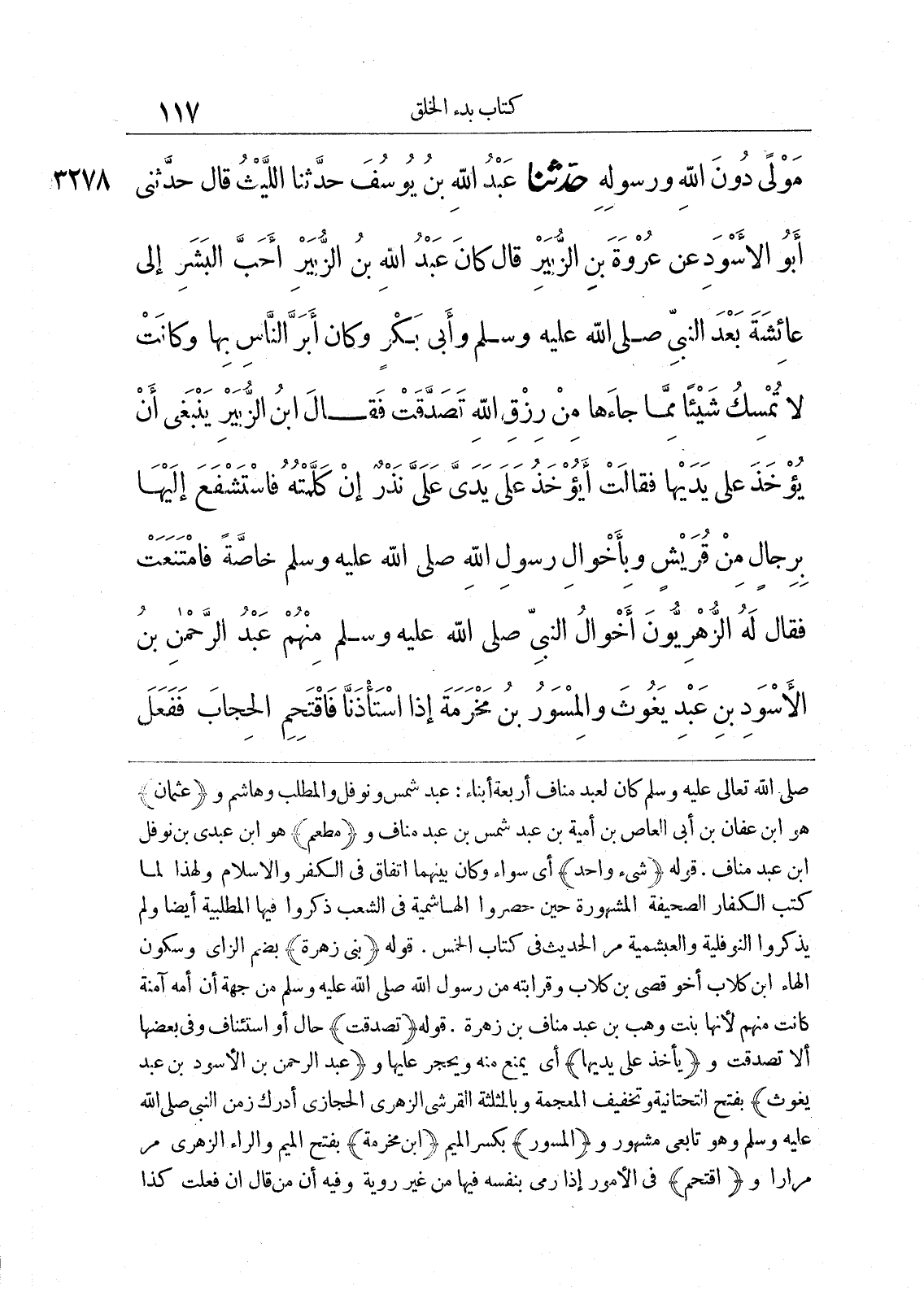 3278 - حَدَّثَنَا عَبْدُ اللَّهِ بْنُ يُوسُفَ حَدَّثَنَا اللَّيْثُ قَالَ حَدَّثَنِى أَبُو الأَسْوَدِ عَنْ عُرْوَةَ بْنِ الزُّبَيْرِ قَالَ كَانَ عَبْدُ اللَّهِ بْنُ الزُّبَيْرِ أَحَبَّ الْبَشَرِ إِلَى عَائِشَةَ بَعْدَ النَّبِىِّ صلى الله عليه وسلم وَأَبِى بَكْرٍ، وَكَان أَبَرَّ النَّاسِ بِهَا، وَكَانَتْ لاَ تُمْسِكُ شَيْئاً مِمَّا جَاءَهَا مِنْ رِزْقِ اللَّهِ {إِلاَّ} تَصَدَّقَتْ. فَقَالَ ابْنُ الزُّبَيْرِ يَنْبَغِى أَنْ يُؤْخَذَ عَلَى يَدَيْهَا. فَقَالَتْ أَيُؤْخَذُ عَلَى يَدَىَّ عَلَىَّ نَذْرٌ إِنْ كَلَّمْتُهُ. فَاسْتَشْفَعَ إِلَيْهَا بِرِجَالٍ مِنْ قُرَيْشٍ وَبِأَخْوَالِ رَسُولِ اللَّهِ صلى الله عليه وسلم خَاصَّةً فَامْتَنَعَتْ، فَقَالَ لَهُ الزُّهْرِيُّونَ أَخْوَالُ النَّبِىِّ صلى الله عليه وسلم مِنْهُمْ عَبْدُ الرَّحْمَنِ بْنُ الأَسْوَدِ بْنِ عَبْدِ يَغُوثَ وَالْمِسْوَرُ بْنُ مَخْرَمَةَ إِذَا اسْتَاذَنَّا فَاقْتَحِمِ الْحِجَابَ فَفَعَلَ
