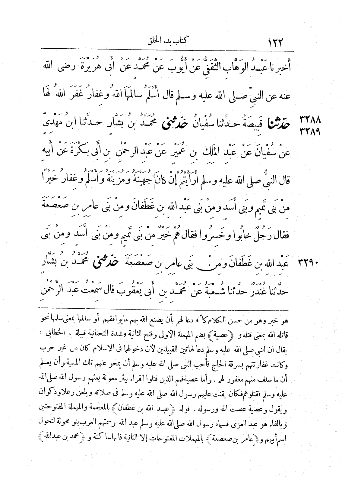 هو خبر وهو من حسن الكلام كأن دعا لهم بأن يصنع الله بهم ما يوافقهم أو سالمها بمعنىسلها نحو قاتله الله بمعنى قتله و (عصية) بضم المهملة الأولى وفتح الثانية وشدة التحتانية قبيلة. الخطابي: يقال أن النبي ? دعا لهاتين القبيلتين لأن دخولهما في الإسلام كان من غير حرب وكانت غفار تتهم بسرقة الحاج فأحب النبي ? أن يمحو عنهم تلك المسبة وأن يعلم أن ما سلف منهم مغفور لهم. وأما عصية فهم الذين قتلوا القراء ببئر معونة بعثهم رسول الله ? فقتلوهم فكان يقنت عليهم رسول الله ? في صلاته ويلعن رعلاً وذكوان ويقول وعصية عصت الله ورسوله. قوله (عبد الله بن غطفان) بالمعجمة والمهملة المفتوحتين وبالفاء هو عبد العزى فسماه رسول الله ? وسمتهم العرب بنو محولة لتحول اسم أبيهم و (عامر بن صعصعة) بالمهملات المفتوحات إلا الثانية فإنها ساكنة و (محمد بن عبد الله)