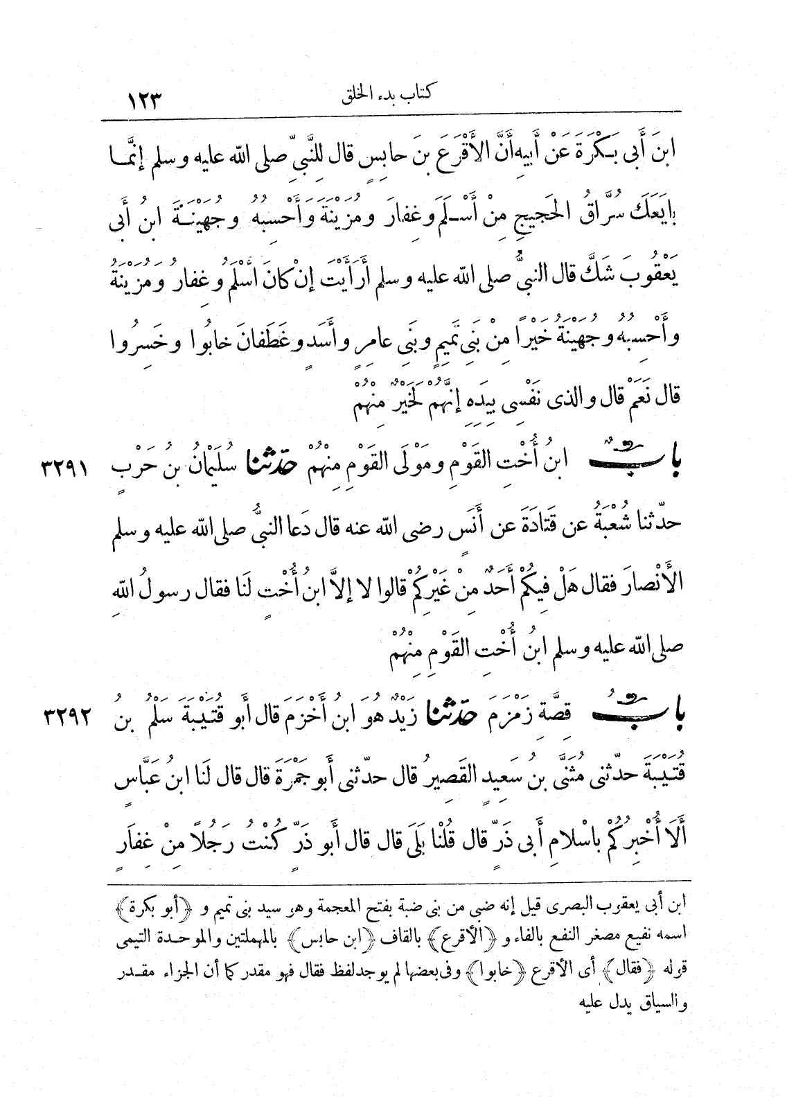 بْنَ أَبِى بَكْرَةَ عَنْ أَبِيهِ أَنَّ الأَقْرَعَ بْنَ حَابِسٍ قَالَ لِلنَّبِىِّ صلى الله عليه وسلم إِنَّمَا بَايَعَكَ سُرَّاقُ الْحَجِيجِ مِنْ أَسْلَمَ وَغِفَارَ وَمُزَيْنَةَ - وَأَحْسِبُهُ وَجُهَيْنَةَ ابْنُ أَبِى يَعْقُوبَ شَكَّ - قَالَ النَّبِىُّ صلى الله عليه وسلم «أَرَأَيْتَ إِنْ كَانَ أَسْلَمُ وَغِفَارُ وَمُزَيْنَةُ - وَأَحْسِبُهُ - وَجُهَيْنَةُ خَيْراً مِنْ بَنِى تَمِيمٍ وَبَنِى عَامِرٍ وَأَسَدٍ وَغَطَفَانَ، خَابُوا وَخَسِرُوا». قَالَ نَعَمْ. قَالَ «وَالَّذِى نَفْسِى بِيَدِهِ، إِنَّهُمْ لَخَيْرٌ مِنْهُمْ».