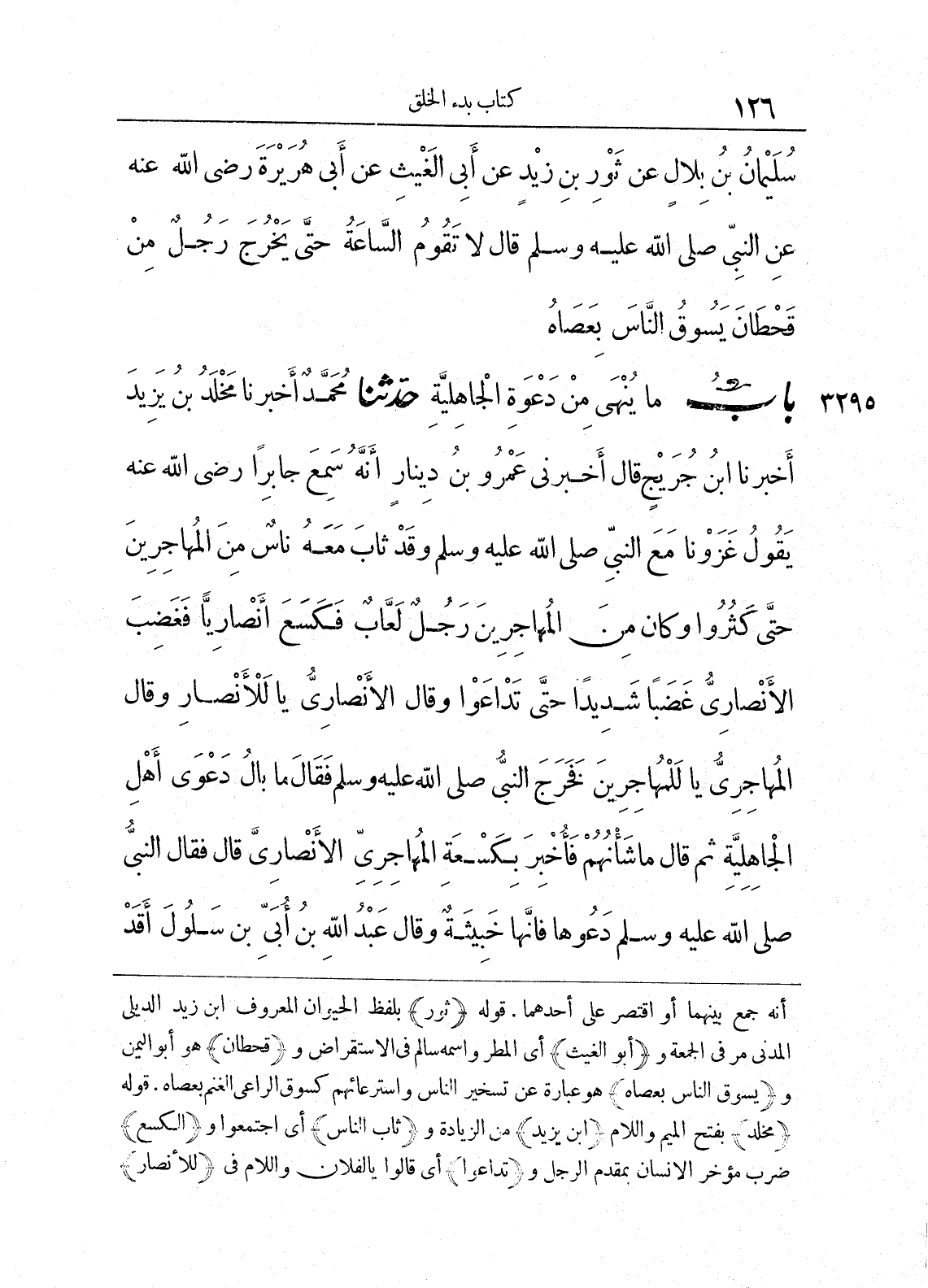 3295 - حَدَّثَنَا مُحَمَّدٌ أَخْبَرَنَا مَخْلَدُ بْنُ يَزِيدَ أَخْبَرَنَا ابْنُ جُرَيْجٍ قَالَ أَخْبَرَنِى عَمْرُو بْنُ دِينَارٍ أَنَّهُ سَمِعَ جَابِراً - رضى الله عنه - يَقُولُ غَزَوْنَا مَعَ النَّبِىِّ صلى الله عليه وسلم وَقَدْ ثَابَ مَعَهُ نَاسٌ مِن الْمُهَاجِرِينَ حَتَّى كَثُرُوا، وَكَانَ مِنَ الْمُهَاجِرِينَ رَجُلٌ لَعَّابٌ فَكَسَعَ أَنْصَارِيًّا، فَغَضِبَ الأَنْصَارِىُّ غَضَباً شَدِيداً، حَتَّى تَدَاعَوْا، وَقَالَ الأَنْصَارِىُّ يَا لَلأَنْصَارِ. وَقَالَ الْمُهَاجِرِىُّ يَا لَلْمُهَاجِرِينَ. فَخَرَجَ النَّبِىُّ صلى الله عليه وسلم فَقَالَ «مَا بَالُ دَعْوَى أَهْلِ الْجَاهِلِيَّةِ». ثُمَّ قَالَ «مَا شَانُهُمْ». فَأُخْبِرَ بِكَسْعَةِ الْمُهَاجِرِىِّ الأَنْصَارِىَّ قَالَ فَقَالَ النَّبِىُّ صلى الله عليه وسلم «دَعُوهَا فَإِنَّهَا خَبِيثَةٌ». وَقَالَ عَبْدُ اللَّهِ بْنُ أُبَىٍّ ابْنُ سَلُولَ أَقَدْ
