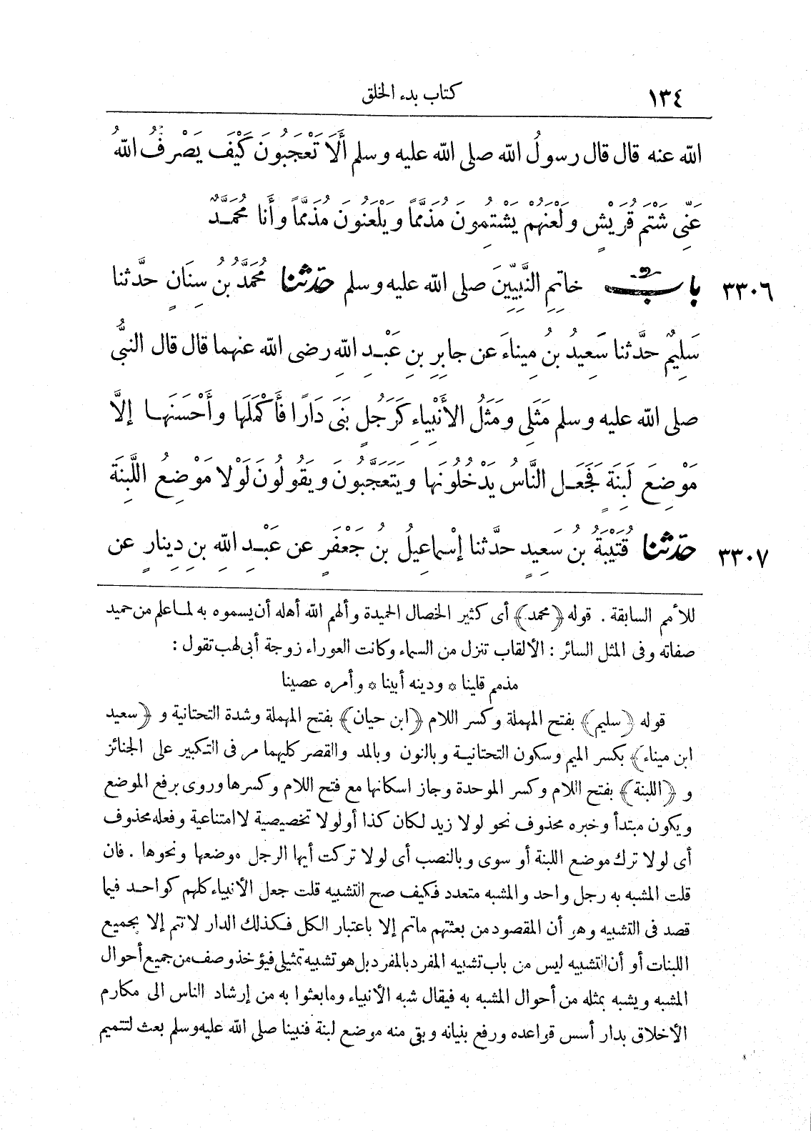 3306 - حَدَّثَنَا مُحَمَّدُ بْنُ سِنَانٍ حَدَّثَنَا سَلِيمٌ حَدَّثَنَا سَعِيدُ بْنُ مِينَاءَ عَنْ جَابِرِ بْنِ عَبْدِ اللَّهِ - رضى الله عنهما قَالَ قَالَ النَّبِىُّ صلى الله عليه وسلم «مَثَلِى وَمَثَلُ الأَنْبِيَاءِ كَرَجُلٍ بَنَى دَاراً فَأَكْمَلَهَا وَأَحْسَنَهَا، إِلاَّ مَوْضِعَ لَبِنَةٍ، فَجَعَلَ النَّاسُ يَدْخُلُونَهَا وَيَتَعَجَّبُونَ، وَيَقُولُونَ لَوْلاَ مَوْضِعُ اللَّبِنَةِ».