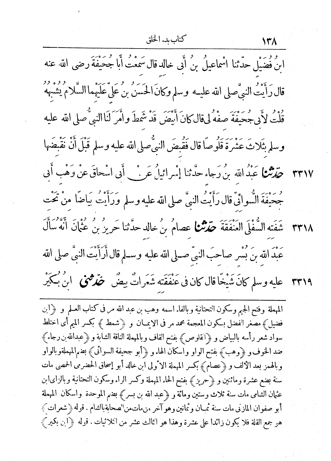 3317 - حَدَّثَنَا عَبْدُ اللَّهِ بْنُ رَجَاءٍ حَدَّثَنَا إِسْرَائِيلُ عَنْ أَبِى إِسْحَاقَ عَنْ وَهْبٍ أَبِى جُحَيْفَةَ السُّوَائِىِّ قَالَ رَأَيْتُ النَّبِىَّ صلى الله عليه وسلم وَرَأَيْتُ بَيَاضاً مِنْ تَحْتِ شَفَتِهِ السُّفْلَى الْعَنْفَقَةَ.