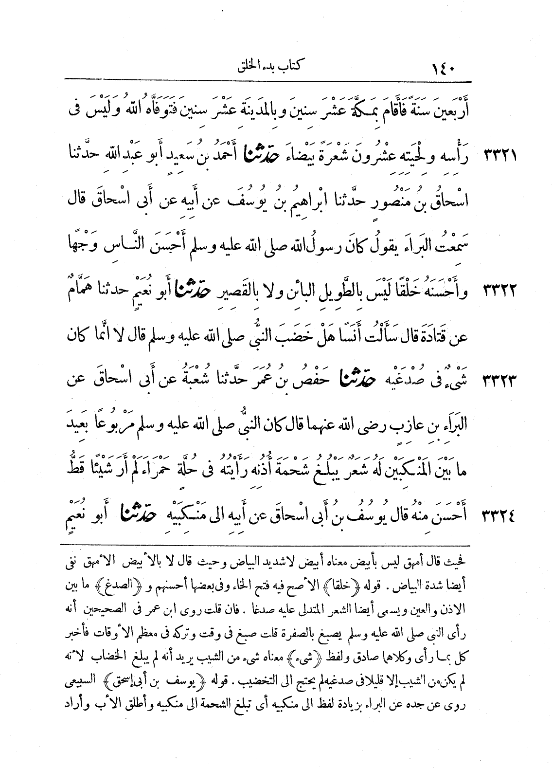 3321 - حَدَّثَنَا أَحْمَدُ بْنُ سَعِيدٍ أَبُو عَبْدِ اللَّهِ حَدَّثَنَا إِسْحَاقُ بْنُ مَنْصُورٍ حَدَّثَنَا إِبْرَاهِيمُ بْنُ يُوسُفَ عَنْ أَبِيهِ عَنْ أَبِى إِسْحَاقَ قَالَ سَمِعْتُ الْبَرَاءَ يَقُولُ كَانَ رَسُولُ اللَّهِ صلى الله عليه وسلم أَحْسَنَ النَّاسِ وَجْهاً وَأَحْسَنَهُ خَلْقاً، لَيْسَ بِالطَّوِيلِ الْبَائِنِ وَلاَ بِالْقَصِيرِ.