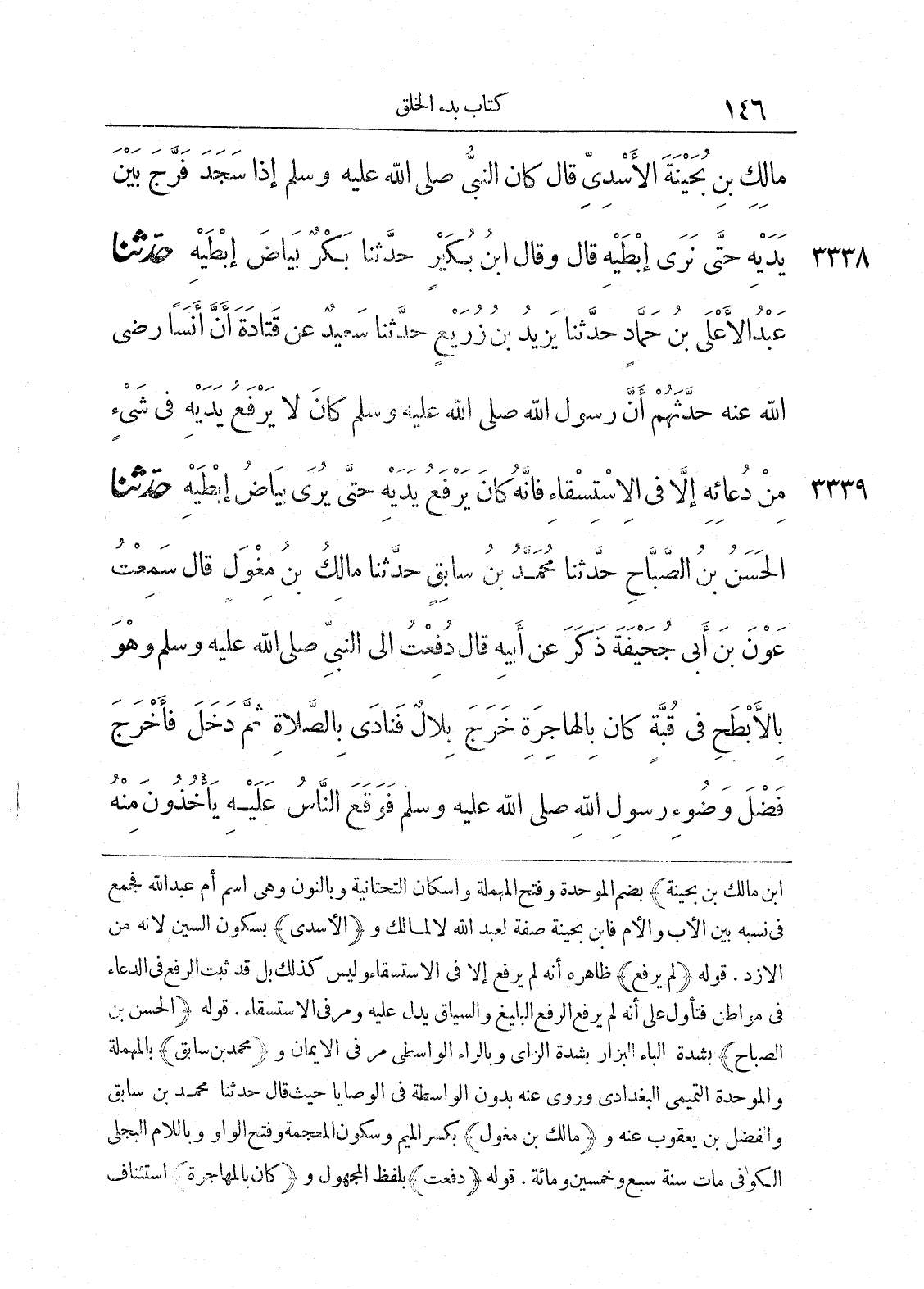 3338 - حَدَّثَنَا عَبْدُ الأَعْلَى بْنُ حَمَّادٍ حَدَّثَنَا يَزِيدُ بْنُ زُرَيْعٍ حَدَّثَنَا سَعِيدٌ عَنْ قَتَادَةَ أَنَّ أَنَساً - رضى الله عنه - حَدَّثَهُمْ أَنَّ رَسُولَ اللَّهِ صلى الله عليه وسلم كَانَ لاَ يَرْفَعُ يَدَيْهِ فِى شَىْءٍ مِن دُعَائِهِ، إِلاَّ فِى الاِسْتِسْقَاءِ، فَإِنَّهُ كَانَ يَرْفَعُ يَدَيْهِ حَتَّى يُرَى بَيَاضُ إِبْطَيْهِ.