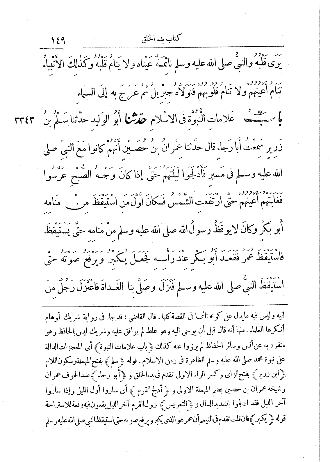 3343 - حَدَّثَنَا أَبُو الْوَلِيدِ حَدَّثَنَا سَلْمُ بْنُ زَرِيرٍ سَمِعْتُ أَبَا رَجَاءٍ قَالَ حَدَّثَنَا عِمْرَانُ بْنُ حُصَيْنٍ أَنَّهُمْ كَانُوا مَعَ النَّبِىِّ صلى الله عليه وسلم فِى مَسِيرٍ، فَأَدْلَجُوا لَيْلَتَهُمْ حَتَّى إِذَا كَانَ وَجْهُ الصُّبْحِ عَرَّسُوا فَغَلَبَتْهُمْ أَعْيُنُهُمْ حَتَّى ارْتَفَعَتِ الشَّمْسُ، فَكَانَ أَوَّلَ مَنِ اسْتَيْقَظَ مِنْ مَنَامِهِ أَبُو بَكْرٍ، وَكَانَ لاَ يُوقَظُ رَسُولُ اللَّهِ صلى الله عليه وسلم مِنْ مَنَامِهِ حَتَّى يَسْتَيْقِظَ، فَاسْتَيْقَظَ عُمَرُ فَقَعَدَ أَبُو بَكْرٍ عِنْدَ رَاسِهِ فَجَعَلَ يُكَبِّرُ وَيَرْفَعُ صَوْتَهُ، حَتَّى اسْتَيْقَظَ النَّبِىُّ صلى الله عليه وسلم فَنَزَلَ وَصَلَّى بِنَا الْغَدَاةَ، فَاعْتَزَلَ رَجُلٌ مِنَ