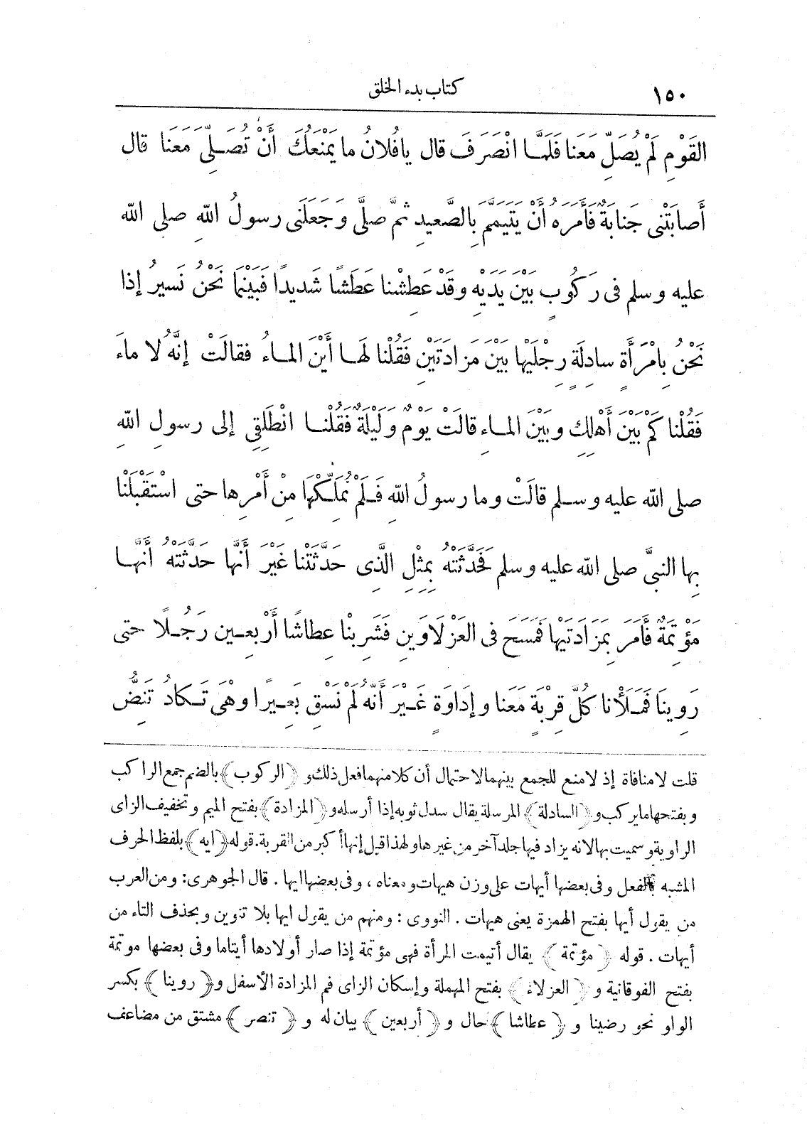 قلت لا منافاة إذ لا منع للجمع بينهما لاحتمال أن كلا منهما فعل ذلك و (الركوب) بالضم جمع الراكب وبفتحها ما يركب و (السادلة) المرسلة يقال سدل ثوبه إذا أرسله و (المزاده) بفتح الميم وتخفيف الزاي الراوية وسميت بها لأنه يراد فيها جلد آخر من غيرها ولهذا قبل إنها أكبر من القربة. قوله (ايه) بلفظ الحرف المشبه بالفعل وفي بعضها أيهات على وزن هيهات ومعناه، وفي بعضها ليها. قال الجوهري: ومن العرب من يقول أيها بفتح الهمزة يعني هيهات. النووي: ومنهم من يقول أيها بلا تنوين وبحذف التاء من أيهات. قوله (مؤتمة) يقال أتيمت المرأة فهي مؤتمة إذا صار أولادها أيتاماً وفي بعضها موتمة بفتح الفوقانية و (العزلاء) بفتح المهملة وإسكان الزاي فم المزادة الأسفل و (روينا) بكسر الواو نحو رضينا و (عطاشا) حال و (أربعين) بيان له و (تنصر) مشتق من مضاعف