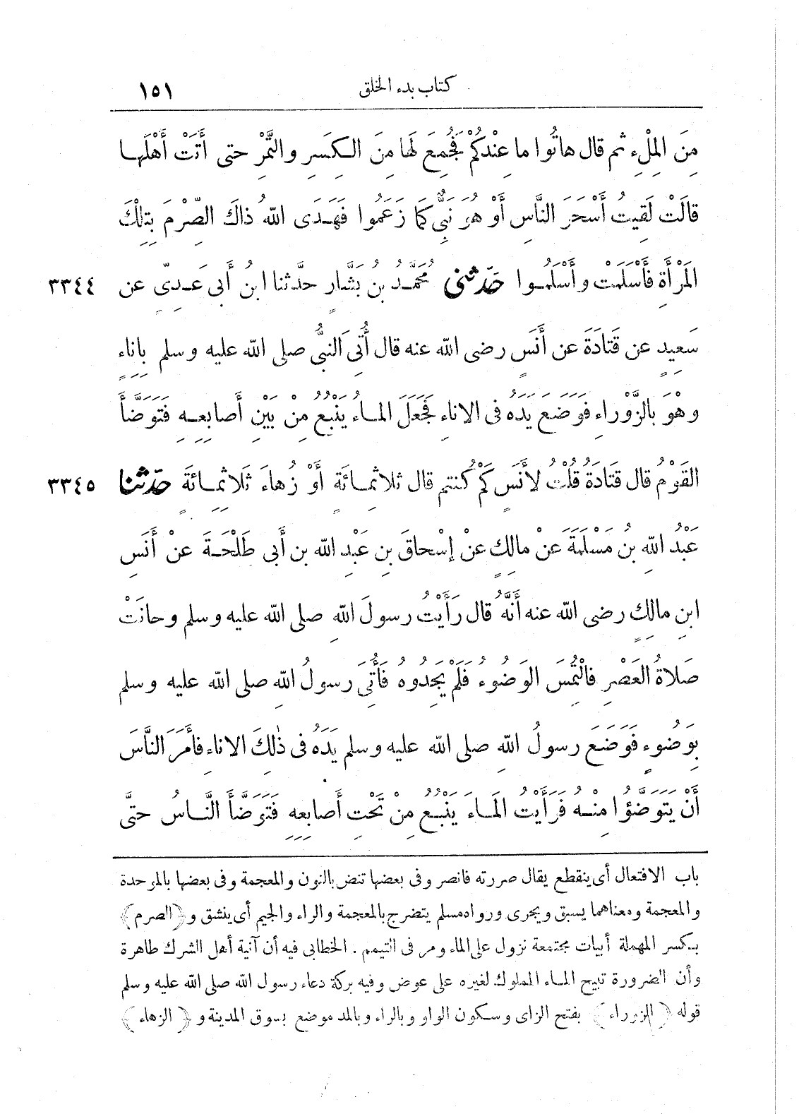 3344 - حَدَّثَنِى مُحَمَّدُ بْنُ بَشَّارٍ حَدَّثَنَا ابْنُ أَبِى عَدِىٍّ عَنْ سَعِيدٍ عَنْ قَتَادَةَ عَنْ أَنَسٍ - رضى الله عنه - قَالَ أُتِىَ النَّبِىُّ صلى الله عليه وسلم بِإِنَاءٍ وَهْوَ بِالزَّوْرَاءِ، فَوَضَعَ يَدَهُ فِى الإِنَاءِ، فَجَعَلَ الْمَاءُ يَنْبُعُ مِنْ بَيْنِ أَصَابِعِهِ، فَتَوَضَّأَ الْقَوْمُ. قَالَ قَتَادَةُ قُلْتُ لأَنَسٍ كَمْ كُنْتُمْ قَالَ ثَلاَثَمِائَةٍ، أَوْ زُهَاءَ ثَلاَثِمِائَةٍ.