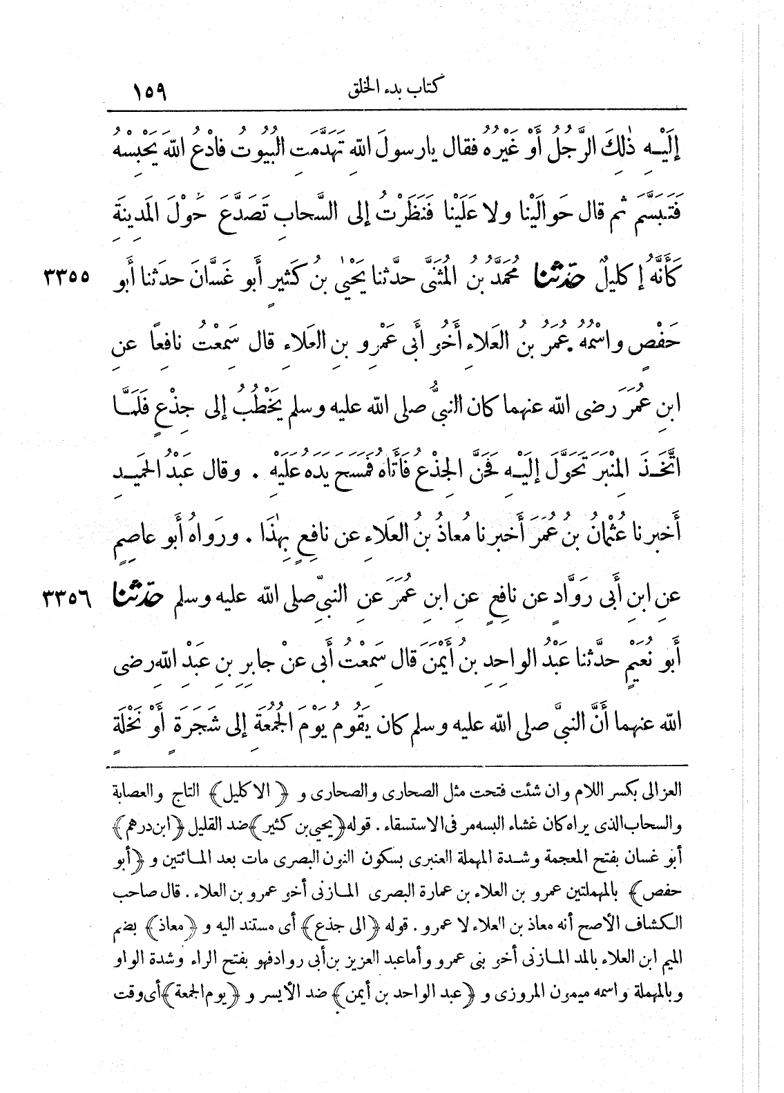 3355 - حَدَّثَنَا مُحَمَّدُ بْنُ الْمُثَنَّى حَدَّثَنَا يَحْيَى بْنُ كَثِيرٍ أَبُو غَسَّانَ حَدَّثَنَا أَبُو حَفْصٍ - وَاسْمُهُ عُمَرُ بْنُ الْعَلاَءِ أَخُو أَبِى عَمْرِو بْنِ الْعَلاَءِ - قَالَ سَمِعْتُ نَافِعاً عَنِ ابْنِ عُمَرَ - رضى الله عنهما - كَانَ النَّبِىُّ صلى الله عليه وسلم يَخْطُبُ إِلَى جِذْعٍ فَلَمَّا اتَّخَذَ الْمِنْبَرَ تَحَوَّلَ إِلَيْهِ، فَحَنَّ الْجِذْعُ فَأَتَاهُ فَمَسَحَ يَدَهُ عَلَيْهِ. وَقَالَ عَبْدُ الْحَمِيدِ أَخْبَرَنَا عُثْمَانُ بْنُ عُمَرَ أَخْبَرَنَا مُعَاذُ بْنُ الْعَلاَءِ عَنْ نَافِعٍ بِهَذَا. وَرَوَاهُ أَبُو عَاصِمٍ عَنِ ابْنِ أَبِى رَوَّادٍ عَنْ نَافِعٍ عَنِ ابْنِ عُمَرَ عَنِ النَّبِىِّ صلى الله عليه وسلم.