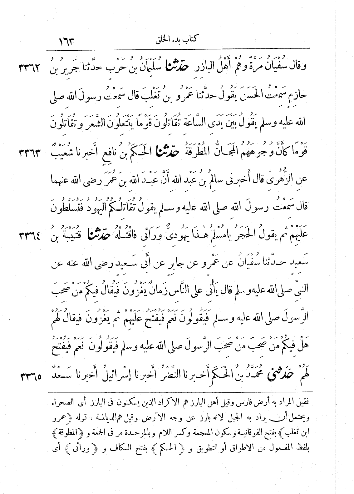 3362 - حَدَّثَنَا سُلَيْمَانُ بْنُ حَرْبٍ حَدَّثَنَا جَرِيرُ بْنُ حَازِمٍ سَمِعْتُ الْحَسَنَ يَقُولُ حَدَّثَنَا عَمْرُو بْنُ تَغْلِبَ قَالَ سَمِعْتُ رَسُولَ اللَّهِ صلى الله عليه وسلم يَقُولُ «بَيْنَ يَدَىِ السَّاعَةِ تُقَاتِلُونَ قَوْماً يَنْتَعِلُونَ الشَّعَرَ، وَتُقَاتِلُونَ قَوْماً كَأَنَّ وُجُوهَهُمُ الْمَجَانُّ الْمُطْرَقَةُ».