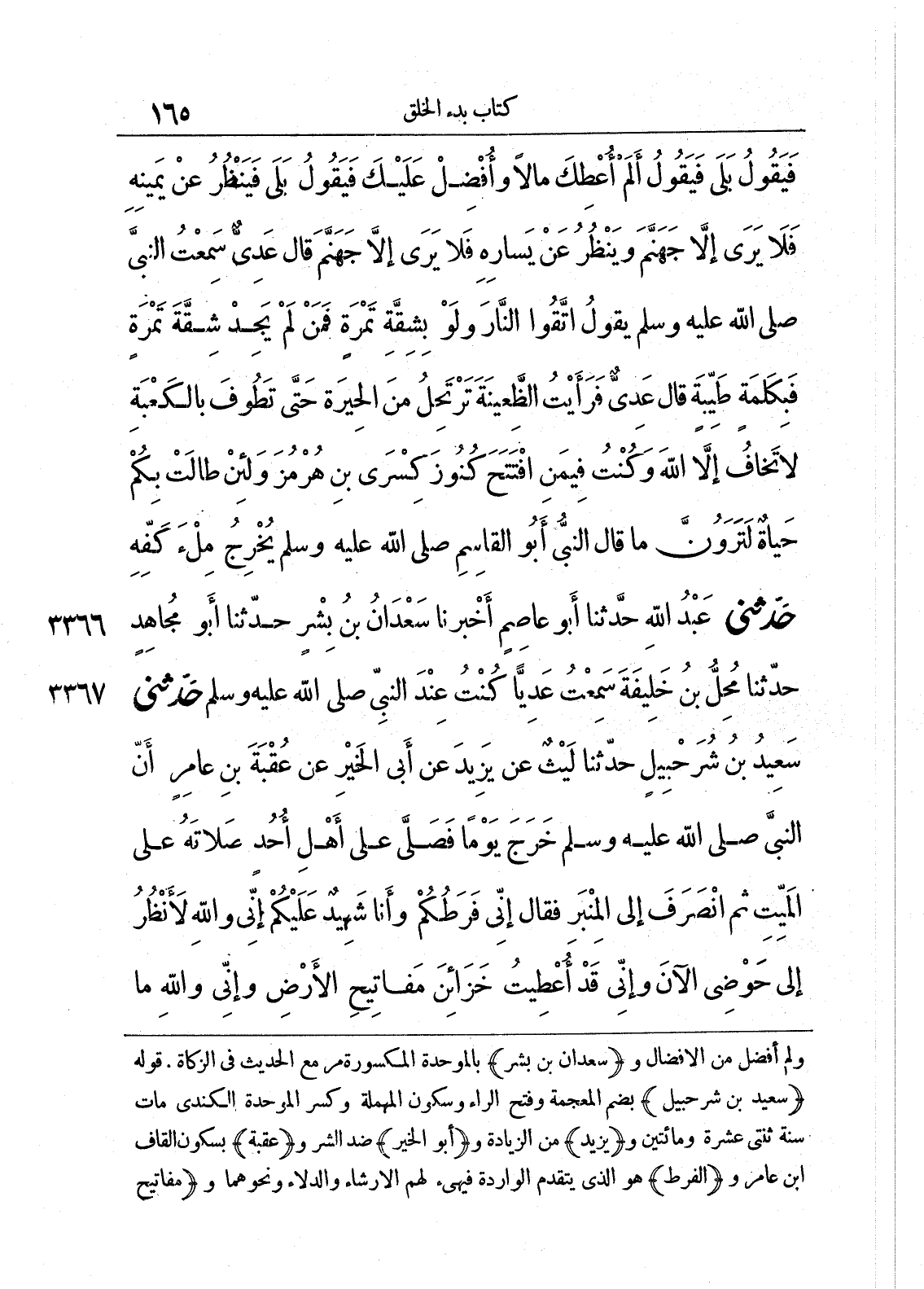 3366 - حَدَّثَنِى عَبْدُ اللَّهِ حَدَّثَنَا أَبُو عَاصِمٍ أَخْبَرَنَا سَعْدَانُ بْنُ بِشْرٍ حَدَّثَنَا أَبُو مُجَاهِدٍ حَدَّثَنَا مُحِلُّ بْنُ خَلِيفَةَ سَمِعْتُ عَدِيًّا كُنْتُ عِنْدَ النَّبِىِّ صلى الله عليه وسلم.