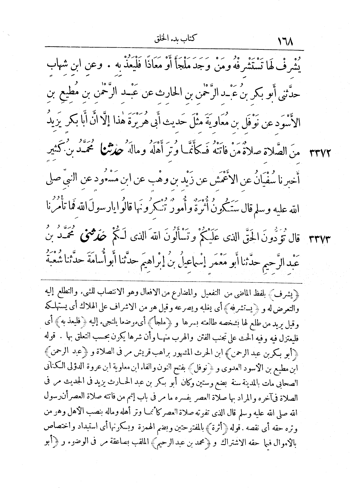 (يشرف) بلفظ الماضي من التفعيل والمضارع من الأفعال وهو الانتصاب للشيء والتطلع إليه والتعرض له و (يستشرفه) أي يغلبه ويصرعه وقيل هو من الإشراف على الهلاك أي يستهلكه وقيل يريد من طلع لها بشخصه طالعته بسرها و (ملجأ) أي موضعا يلتجئ إليه (فليعذ به) أي فليعتزل فيه وفيه الحث على تجنب الفتن والهرب منها وأن شرها يكون بحسب التعلق بها. قوله (أبو بكر بن عبد الرحمن) ابن الحرث المشهور براهب قريش مر في الصلاة و (عبد الرحمن) ابن مطيع بن الأسود العدوي و (نوفل) بفتح النون والفاء ابن معاوية ابن عروة الدؤلي الكناني الصحابي مات بالمدينة سنة بضع وستين وكان أبو بكر بن عبد الحارث يزيد في الحديث مر في الصلاة في آخره والمراد بها صلاة العصر يفسره ما مر في باب إثم من فاتته صلاة العصر أن رسول الله ? قال الذي تفوته صلاة العصر كأنما وتر أهله وماله بنصب الأهل وهو من وتره حقه أي نقصه. قوله (أثرة) بالمفتوحتين وبضم الهمزة وبسكونها أي استبداد واختصاص بالأموال فيما حقه الاشتراك و (محمد بن عبد الرحيم) الملقب بصاعقة مر في الوضوء و (أبو