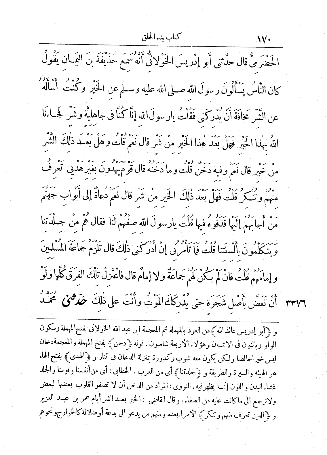 الْحَضْرَمِىُّ قَالَ حَدَّثَنِى أَبُو إِدْرِيسَ الْخَوْلاَنِىُّ أَنَّهُ سَمِعَ حُذَيْفَةَ بْنَ الْيَمَانِ يَقُولُ كَانَ النَّاسُ يَسْأَلُونَ رَسُولَ اللَّهِ صلى الله عليه وسلم عَنِ الْخَيْرِ، وَكُنْتُ أَسْأَلُهُ عَنِ الشَّرِّ مَخَافَةَ أَنْ يُدْرِكَنِى. فَقُلْتُ يَا رَسُولَ اللَّهِ إِنَّا كُنَّا فِى جَاهِلِيَّةٍ وَشَرٍّ، فَجَاءَنَا اللَّهُ بِهَذَا الْخَيْرِ، فَهَلْ بَعْدَ هَذَا الْخَيْرِ مِنْ شَرٍّ قَالَ «نَعَمْ». قُلْتُ وَهَلْ بَعْدَ ذَلِكَ الشَّرِّ مِنْ خَيْرٍ قَالَ «نَعَمْ، وَفِيهِ دَخَنٌ». قُلْتُ وَمَا دَخَنُهُ قَالَ «قَوْمٌ يَهْدُونَ بِغَيْرِ هَدْيِى تَعْرِفُ مِنْهُمْ وَتُنْكِرُ». قُلْتُ فَهَلْ بَعْدَ ذَلِكَ الْخَيْرِ مِنْ شَرٍّ قَالَ «نَعَمْ دُعَاةٌ إِلَى أَبْوَابِ جَهَنَّمَ، مَنْ أَجَابَهُمْ إِلَيْهَا قَذَفُوهُ فِيهَا». قُلْتُ يَا رَسُولَ اللَّهِ صِفْهُمْ لَنَا فَقَالَ «هُمْ مِنْ جِلْدَتِنَا، وَيَتَكَلَّمُونَ بِأَلْسِنَتِنَا» قُلْتُ فَمَا تَامُرُنِى إِنْ أَدْرَكَنِى ذَلِكَ قَالَ «تَلْزَمُ جَمَاعَةَ الْمُسْلِمِينَ وَإِمَامَهُمْ». قُلْتُ فَإِنْ لَمْ يَكُنْ لَهُمْ جَمَاعَةٌ وَلاَ إِمَامٌ قَالَ «فَاعْتَزِلْ تِلْكَ الْفِرَقَ كُلَّهَا، وَلَوْ أَنْ تَعَضَّ بِأَصْلِ شَجَرَةٍ حَتَّى يُدْرِكَكَ الْمَوْتُ وَأَنْتَ عَلَى ذَلِكَ».