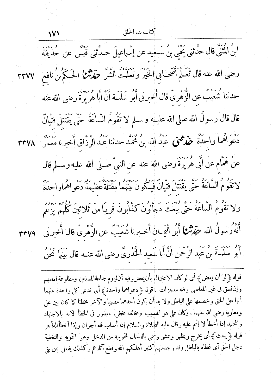 3377 - حَدَّثَنَا الْحَكَمُ بْنُ نَافِعٍ حَدَّثَنَا شُعَيْبٌ عَنِ الزُّهْرِىِّ قَالَ أَخْبَرَنِى أَبُو سَلَمَةَ أَنَّ أَبَا هُرَيْرَةَ - رضى الله عنه - قَالَ قَالَ رَسُولُ اللَّهِ صلى الله عليه وسلم «لاَ تَقُومُ السَّاعَةُ حَتَّى يَقْتَتِلَ فِئَتَانِ دَعْوَاهُمَا وَاحِدَةٌ».