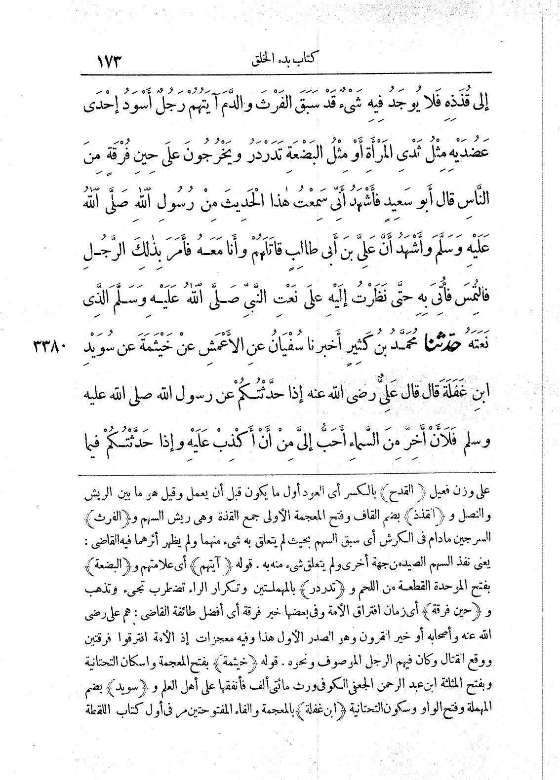 3380 - حَدَّثَنَا مُحَمَّدُ بْنُ كَثِيرٍ أَخْبَرَنَا سُفْيَانُ عَنِ الأَعْمَشِ عَنْ خَيْثَمَةَ عَنْ سُوَيْدِ بْنِ غَفَلَةَ قَالَ قَالَ عَلِىٌّ - رضى الله عنه - إِذَا حَدَّثْتُكُمْ عَنْ رَسُولِ اللَّهِ صلى الله عليه وسلم فَلأَنْ أَخِرَّ مِنَ السَّمَاءِ أَحَبُّ إِلَىَّ مِنْ أَنْ أَكْذِبَ عَلَيْهِ، وَإِذَا حَدَّثْتُكُمْ فِيمَا