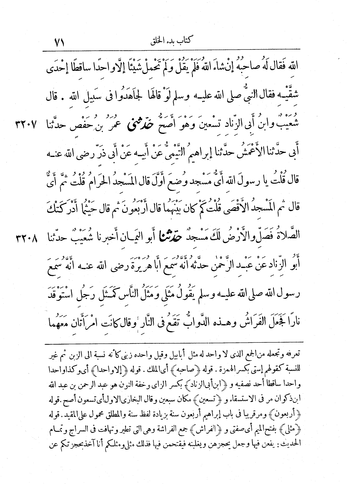 3207 - حَدَّثَنِى عُمَرُ بْنُ حَفْصٍ حَدَّثَنَا أَبِى حَدَّثَنَا الأَعْمَشُ حَدَّثَنَا إِبْرَاهِيمُ التَّيْمِىُّ عَنْ أَبِيهِ عَنْ أَبِى ذَرٍّ رضى الله عنه قَالَ قُلْتُ يَا رَسُولَ اللَّهِ. أَىُّ مَسْجِدٍ وُضِعَ أَوَّلُ قَالَ «الْمَسْجِدُ الْحَرَامُ» قُلْتُ ثُمَّ أَىٌّ قَالَ «ثُمَّ الْمَسْجِدُ الأَقْصَى». قُلْتُ كَمْ كَانَ بَيْنَهُمَا قَالَ «أَرْبَعُونَ» ثُمَّ قَالَ «حَيْثُمَا أَدْرَكَتْكَ الصَّلاَةُ فَصَلِّ، وَالأَرْضُ لَكَ مَسْجِدٌ».