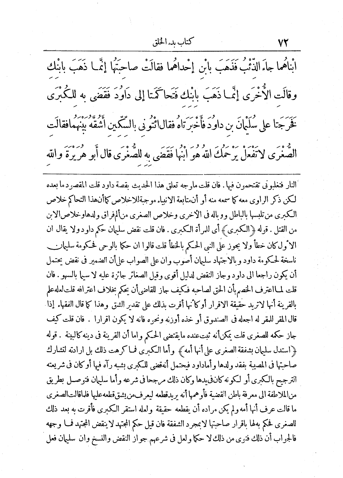 النار فتغلبوني تقتحمون فيها. فإن قلت ما وجه تعلق هذا الحديث بقصة داود قلت المقصود ما بعده لكن ذكر الراوي معه كما سمعه منه أو أن متابعة الأنبياء موجبة للإخلاص كما أن هذا التحاكم خلاص الكبرى من تلبسها بالباطل ووباله في الأخرى وخلاص الصغرى من ألم فراق ولدها وخلاص الابن من القتل. قوله (الكبرى) أي للمرأة الكبرى. فإن قلت نقض سليمان حكم داود ولا يقال أن الأول كان خطأ ولا يجوز على النبي الحكم بالخطأ قلت قالوا أن حكماً بالوحي فحكومة سليمان ناسخة لحكومة داود وبالاجتهاد سليمان أصوب وأن على الصواب على أن الضمير في نقض يحتمل أن يكون راجعاً إلى داود وجاز النقض لدليل أقوى وقيل الصغائر جائزة عليه لا سيما بالسهو. فإن قلت لما اعترف الخصم بأن الحق لصاحبه فكيف جاز للقاضي أن يحكم بخلاف اعترافه قلت لعله علم بالقرينة أنها لا تريد حقيقة الإقرار أو كأنها أقرت بذلك على تقدير الشق وهذا كما قال الفقهاء إذا قال المقر للمقر له اجعله في الصندوق أو خذه أو زنه ونحوه فإنه لا يكون إقراراً. فإن قلت كيف جاز حكمه للصغرى قلت يمكن أنه ثبت عنده ما يقتضي الحكم وإما أن القرينة في دينه كالبينة. قوله (استدل سليمان بشفقة الصغرى على أنها أمه) وأما الكبرى فما كرهت ذلك بل إرادته لتشارك صاحبتها في المصيبة بفقد ولدها وأما داود فيحتمل أنه قضى للكبرى بشبه رآه فيها أو كان في شريعته الترجيح بالكبرى أو لكونه كان في يدها وكان ذلك مرجحاً في شرعه وأما سليمان فتوصل بطريق من الملاطفة إلى معرفة باطن القضية فأوهمها أنه يريد قطعه ليعرف من يشق قطعه عليها فلما قالت الصغرى ما قالت عرف أنها أمه ولم يكن مراده أن يقطعه حقيقة ولعله استقر الكبرى فأقرت به بعد ذلك للصغرى فحكم به لها بإقرار صاحبتها لا بمجرد الشفقة فإن قيل حكم المجتهد لا ينقض المجتهد فما وجهه فالجواب أن ذلك فتوى من ذلك لا حكماً ولعل في شرعهم جواز النقض والنسخ وأن سليمان فعل