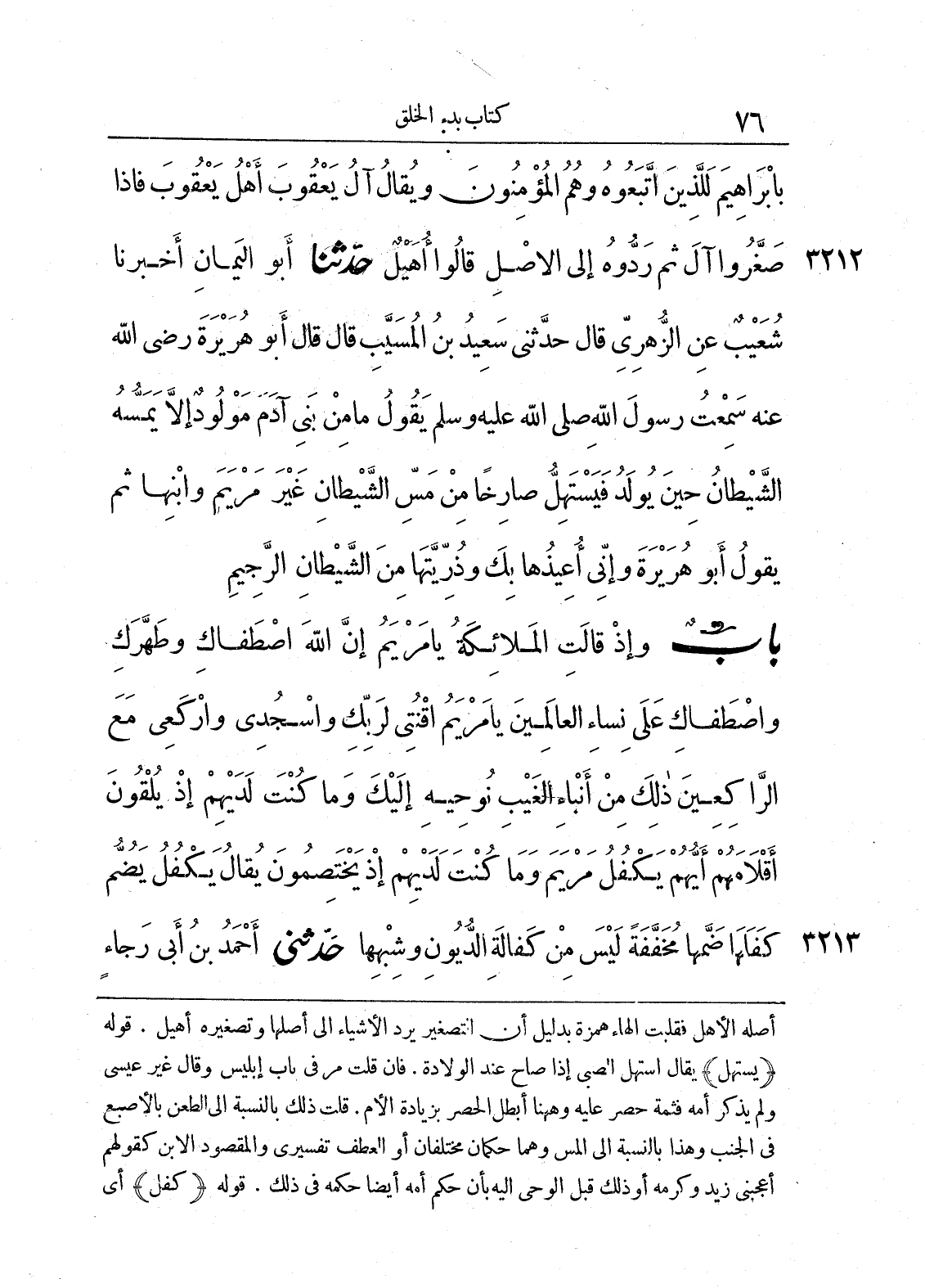 باب (وَإِذْ قَالَتِ الْمَلاَئِكَةُ يَا مَرْيَمُ إِنَّ اللَّهَ اصْطَفَاكِ وَطَهَّرَكِ وَاصْطَفَاكِ عَلَى نِسَاءِ الْعَالَمِينَ). (يَا مَرْيَمُ اقْنُتِى لِرَبِّكِ وَاسْجُدِى وَارْكَعِى مَعَ الرَّاكِعِينَ * ذَلِكَ مِنْ أَنْبَاءِ الْغَيْبِ نُوحِيهِ إِلَيْكَ وَمَا كُنْتَ لَدَيْهِمْ إِذْ يُلْقُونَ أَقْلاَمَهُمْ أَيُّهُمْ يَكْفُلُ مَرْيَمَ وَمَا كُنْتَ لَدَيْهِمْ إِذْ يَخْتَصِمُونَ) يُقَالُ يَكْفُلُ يَضُمُّ، كَفَلَهَا ضَمَّهَا، مُخَفَّفَةً لَيْسَ مِنْ كَفَالَةِ الدُّيُونِ وَشِبْهِهَا.