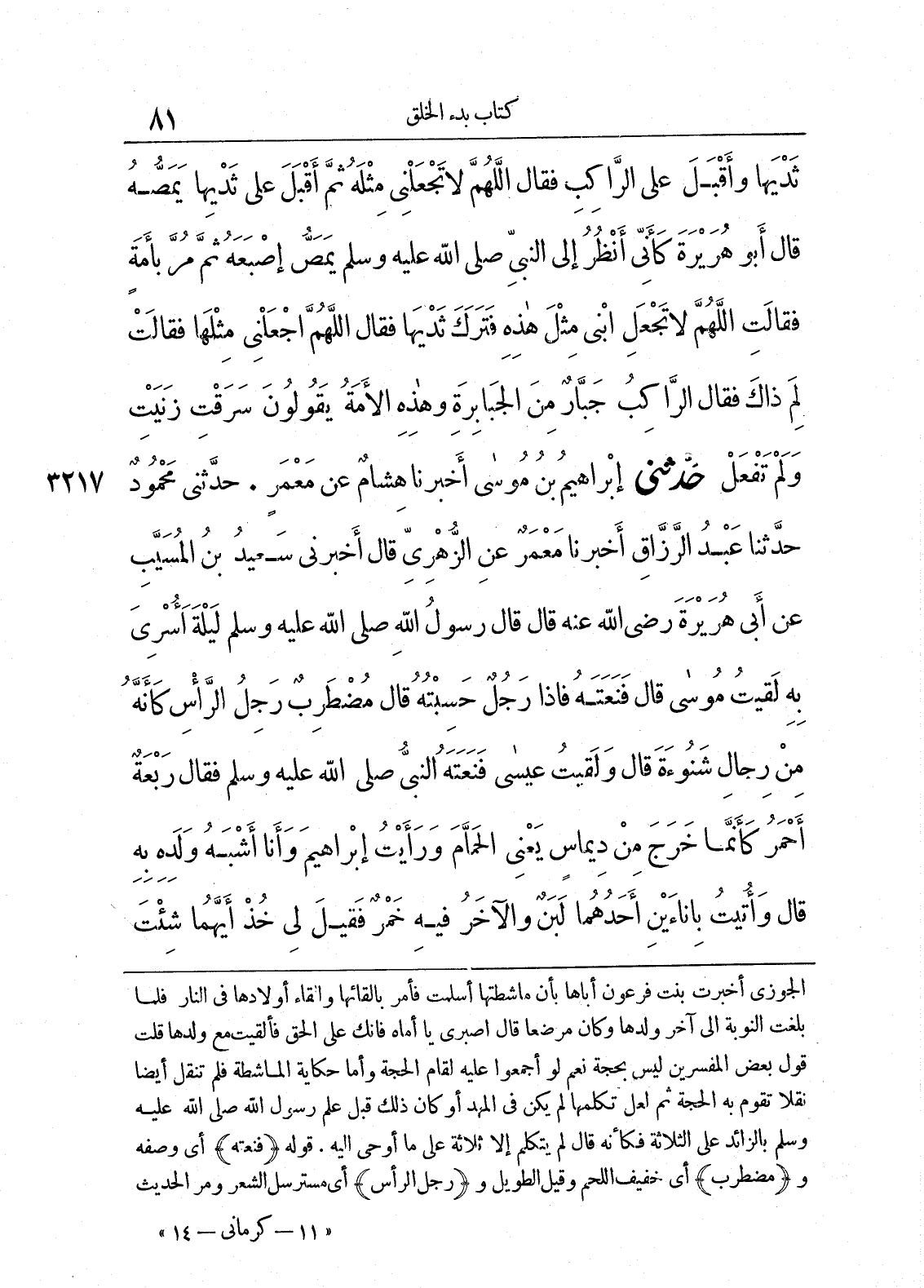 3217 - حَدَّثَنِى إِبْرَاهِيمُ بْنُ مُوسَى أَخْبَرَنَا هِشَامٌ عَنْ مَعْمَرٍ. حَدَّثَنِى مَحْمُودٌ حَدَّثَنَا عَبْدُ الرَّزَّاقِ أَخْبَرَنَا مَعْمَرٌ عَنِ الزُّهْرِىِّ قَالَ أَخْبَرَنِى سَعِيدُ بْنُ الْمُسَيَّبِ عَنْ أَبِى هُرَيْرَةَ - رضى الله عنه - قَالَ قَالَ رَسُولُ اللَّهِ صلى الله عليه وسلم «لَيْلَةَ أُسْرِىَ بِهِ لَقِيتُ مُوسَى - قَالَ فَنَعَتَهُ - فَإِذَا رَجُلٌ - حَسِبْتُهُ قَالَ - مُضْطَرِبٌ رَجِلُ الرَّاسِ، كَأَنَّهُ مِنْ رِجَالِ شَنُوءَةَ - قَالَ - وَلَقِيتُ عِيسَى - فَنَعَتَهُ النَّبِىُّ صلى الله عليه وسلم فَقَالَ - رَبْعَةٌ أَحْمَرُ كَأَنَّمَا خَرَجَ مِنْ دِيمَاسٍ - يَعْنِى الْحَمَّامَ - وَرَأَيْتُ إِبْرَاهِيمَ، وَأَنَا أَشْبَهُ وَلَدِهِ بِهِ - قَالَ - وَأُتِيتُ بِإِنَاءَيْنِ أَحَدُهُمَا لَبَنٌ وَالآخَرُ فِيهِ خَمْرٌ، فَقِيلَ لِى خُذْ أَيَّهُمَا شِئْتَ