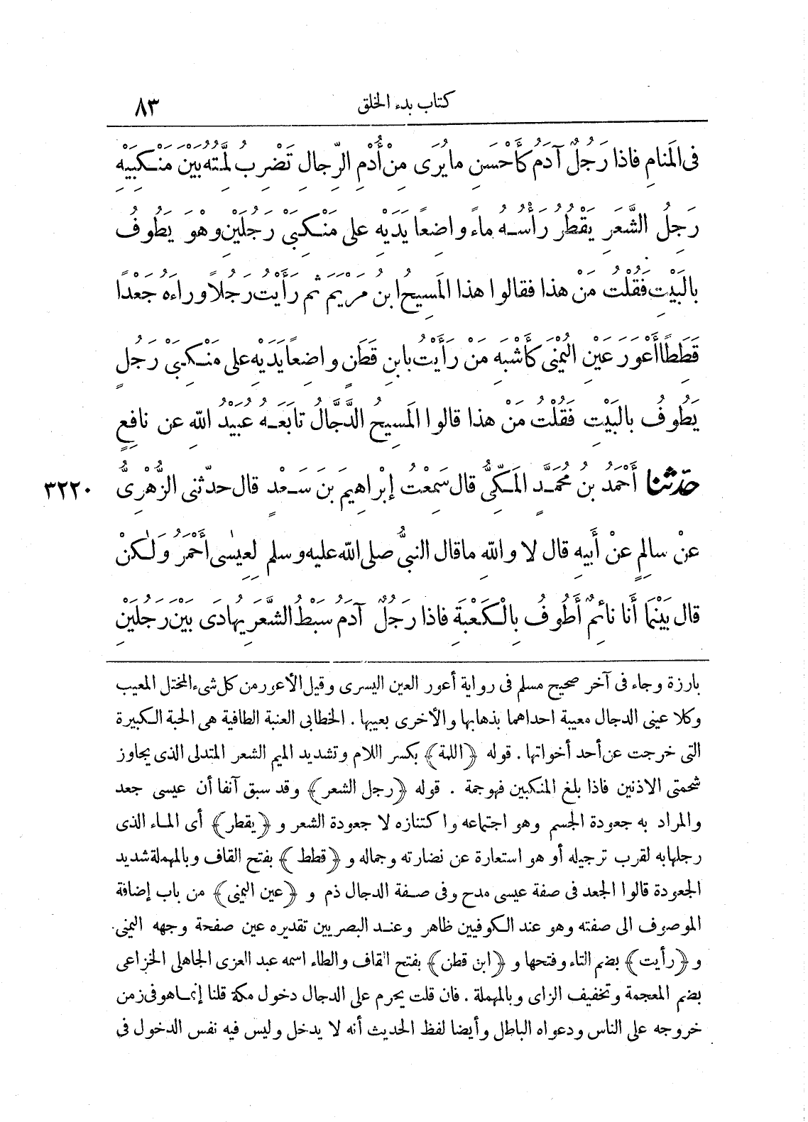 3220 - حَدَّثَنَا أَحْمَدُ بْنُ مُحَمَّدٍ الْمَكِّىُّ قَالَ سَمِعْتُ إِبْرَاهِيمَ بْنَ سَعْدٍ قَالَ حَدَّثَنِى الزُّهْرِىُّ عَنْ سَالِمٍ عَنْ أَبِيهِ، قَالَ لاَ وَاللَّهِ مَا قَالَ النَّبِىُّ صلى الله عليه وسلم لِعِيسَى أَحْمَرُ، وَلَكِنْ قَالَ «بَيْنَمَا أَنَا نَائِمٌ أَطُوفُ بِالْكَعْبَةِ، فَإِذَا رَجُلٌ آدَمُ سَبْطُ الشَّعَرِ، يُهَادَى بَيْنَ رَجُلَيْنِ