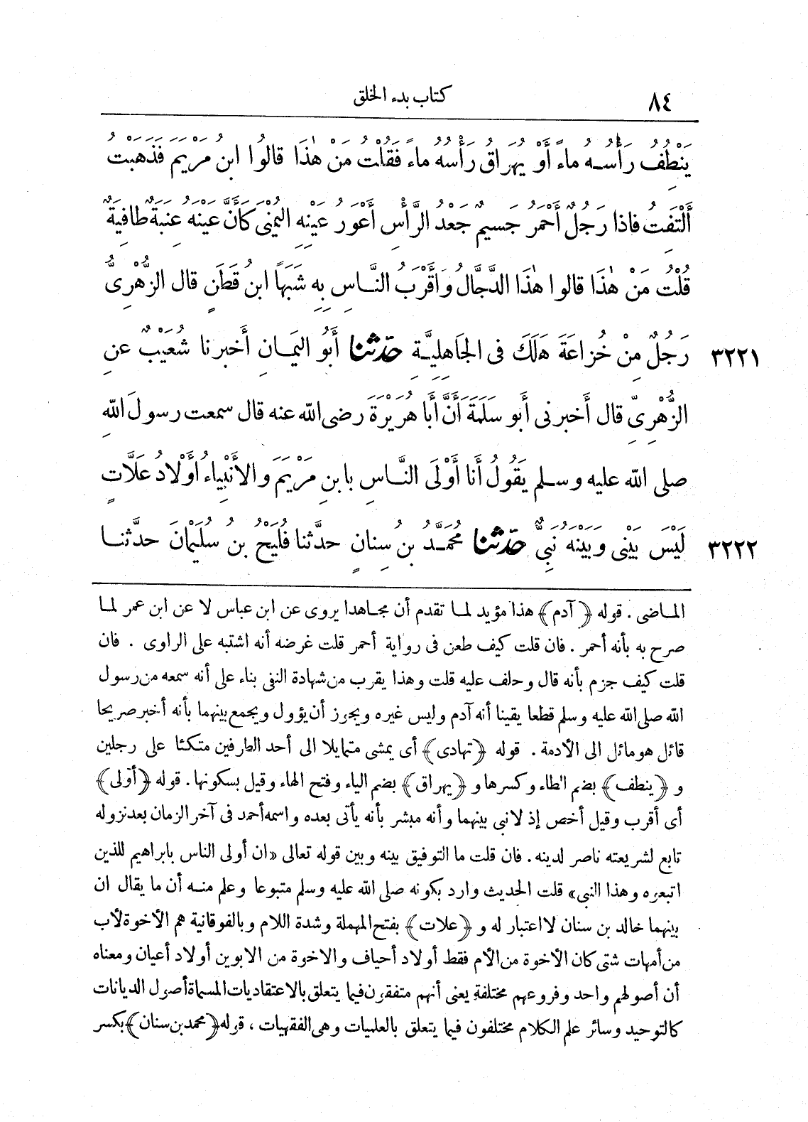 الماضي. قوله (آدم) هذا مؤيد لما تقدم أن مجاهداً يروى عن ابن عباس لا عن ابن عمر لما صرح به بأنه أحمر. فإن قلت كيف طعن في رواية أحمر قلت غرضه أنه اشتبه على الراوي. فإن قلت كيف جزم بأنه قال وحلف عليه قلت وهذا يقرب من شهادة النفي بناء على أنه سمعه من رسول الله صلى الله عليه وسلم قطعاً يقينياً أنه آدم وليس غيره ويجوز أن يؤول ويجمع بينهما بأنه أخبر صريحاً قائل هو مائل إلى الأدمة. قوله (تهادى) أي يمشي متمايلاً إلى أحد الطرفين متكئاً على رجلين و (ينظف) بضم الطاء وكسرها و (يهراق) بضم الياء وفتح الهاء وقيل بسكونها. قوله (أولى) أي أقرب وقيل أخذ إذ لا نبي بينهما وأنه مبشر بأنه يأتي بعده واسمه أحمد في آخر الزمان بعد نزوله تابع لشريعته ناصر لدينه. فإن قلت ما التوفيق بينه وبين قوله تعالى (إن أولى الناس بإبراهيم للذين اتبعوه وهذا النبي) قلت الحديث وارد بكونه صلى الله عليه وسلم متبوعاً وعلم منه أن ما يقال أن بينهما خالد بن سنان لا اعتبار له و (علات) بفتح المهملة وشدة اللام وبالفوقانية هم الأخوة لأب من أمهات شتى كان الأخوة من الأم فقط أولاد أحياف والأخوة من الأبوين أولاد أعيان ومعناه أن أصولهم واحد وفروعهم مختلفة يعني أنهم متفقون فيما يتعلق بالاعتقاديات المسماة أصول الديانات كالتوحيد وسائر علم الكلام مختلفون فيما يتعلق بالعلميات وهي الفقهيات، قوله (محمد بن سنان) بكسر