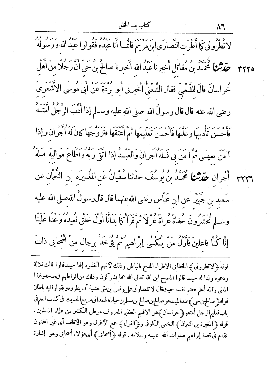 3226 - حَدَّثَنَا مُحَمَّدُ بْنُ يُوسُفَ حَدَّثَنَا سُفْيَانُ عَنِ الْمُغِيرَةِ بْنِ النُّعْمَانِ عَنْ سَعِيدِ بْنِ جُبَيْرٍ عَنِ ابْنِ عَبَّاسٍ - رضى الله عنهما - قَالَ قَالَ رَسُولُ اللَّهِ صلى الله عليه وسلم «تُحْشَرُونَ حُفَاةً عُرَاةً غُرْلاً، ثُمَّ قَرَأَ (كَمَا بَدَانَا أَوَّلَ خَلْقٍ نُعِيدُهُ وَعْداً عَلَيْنَا إِنَّا كُنَّا فَاعِلِينَ) فَأَوَّلُ مَنْ يُكْسَى إِبْرَاهِيمُ، ثُمَّ يُؤْخَذُ بِرِجَالٍ مِنْ أَصْحَابِى ذَاتَ