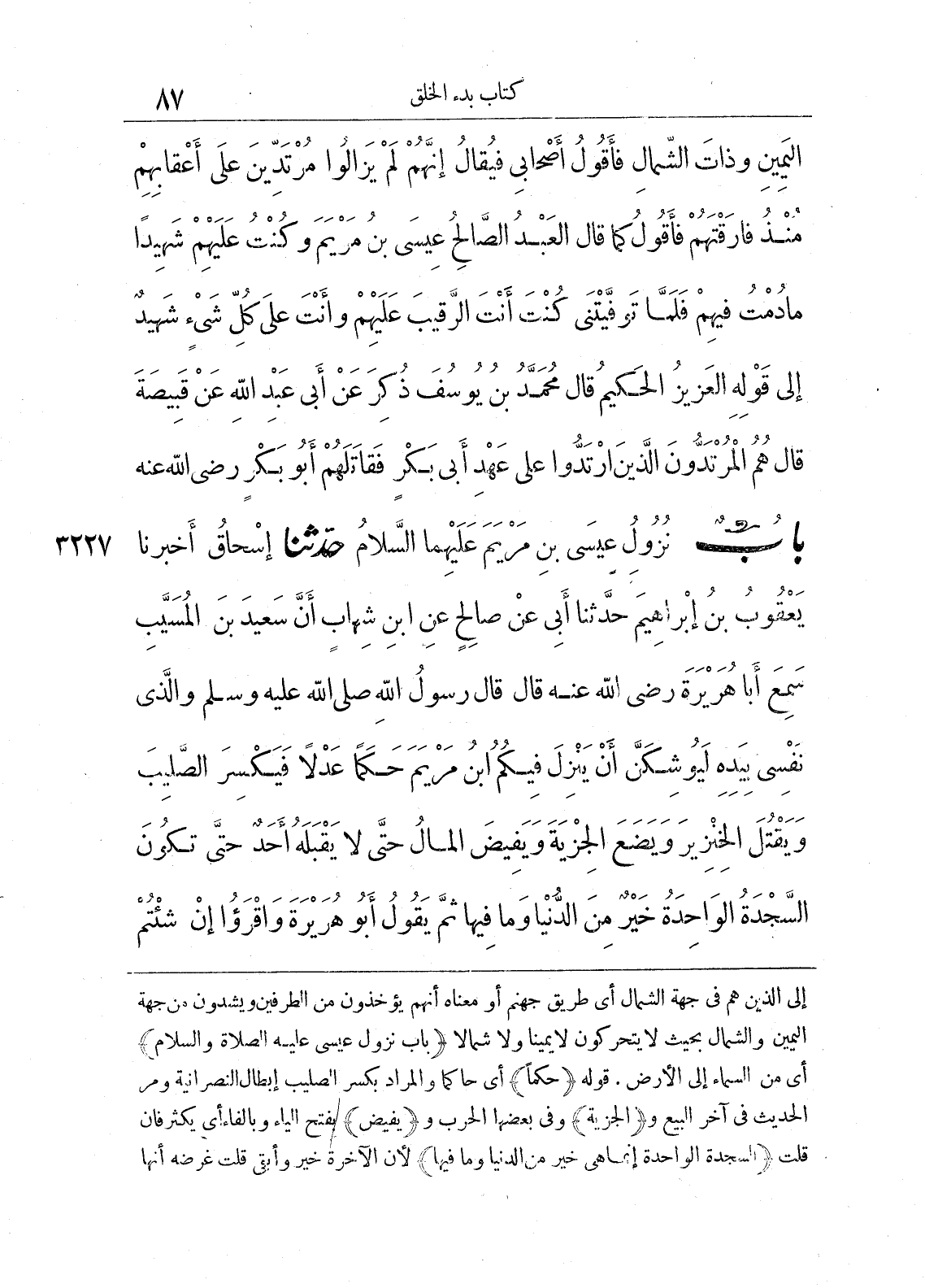 إلى الذين هم في جهة الشمال أي طريق جهنم أو معناه أنهم يؤخذون من الطرفين ويشدون من جهة اليمين والشمال بحيث لا يتحركون لا يميناً ولا شمالاً (باب نزول عيسى عليه الصلاة والسلام) أي من السماء إلى الأرض. قوله (حكماً) أي حاكماً والمراد بكسر الصليب إبطال النصرانية ومر الحديث في آخر البيع و (الجزية) وفي بعضها الحرب و (يفيض) بفتح الياء وبالفاء أي يكثر فإن قلت (السجدة الواحدة إنما هي خير من الدنيا وما فيها) لأن الآخرة خير وأبقى قلت غرضه أنها