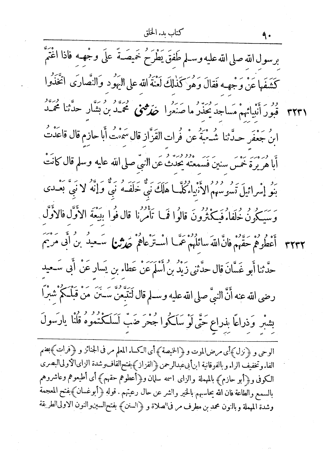 3231 - حَدَّثَنِى مُحَمَّدُ بْنُ بَشَّارٍ حَدَّثَنَا مُحَمَّدُ بْنُ جَعْفَرٍ حَدَّثَنَا شُعْبَةُ عَنْ فُرَاتٍ الْقَزَّازِ قَالَ سَمِعْتُ أَبَا حَازِمٍ قَالَ قَاعَدْتُ أَبَا هُرَيْرَةَ خَمْسَ سِنِينَ، فَسَمِعْتُهُ يُحَدِّثُ عَنِ النَّبِىِّ صلى الله عليه وسلم قَالَ «كَانَتْ بَنُو إِسْرَائِيلَ تَسُوسُهُمُ الأَنْبِيَاءُ، كُلَّمَا هَلَكَ نَبِىٌّ خَلَفَهُ نَبِىٌّ، وَإِنَّهُ لاَ نَبِىَّ بَعْدِى، وَسَيَكُونُ خُلَفَاءُ فَيَكْثُرُونَ. قَالُوا فَمَا تَامُرُنَا قَالَ فُوا بِبَيْعَةِ الأَوَّلِ فَالأَوَّلِ، أَعْطُوهُمْ حَقَّهُمْ، فَإِنَّ اللَّهَ سَائِلُهُمْ عَمَّا اسْتَرْعَاهُمْ».