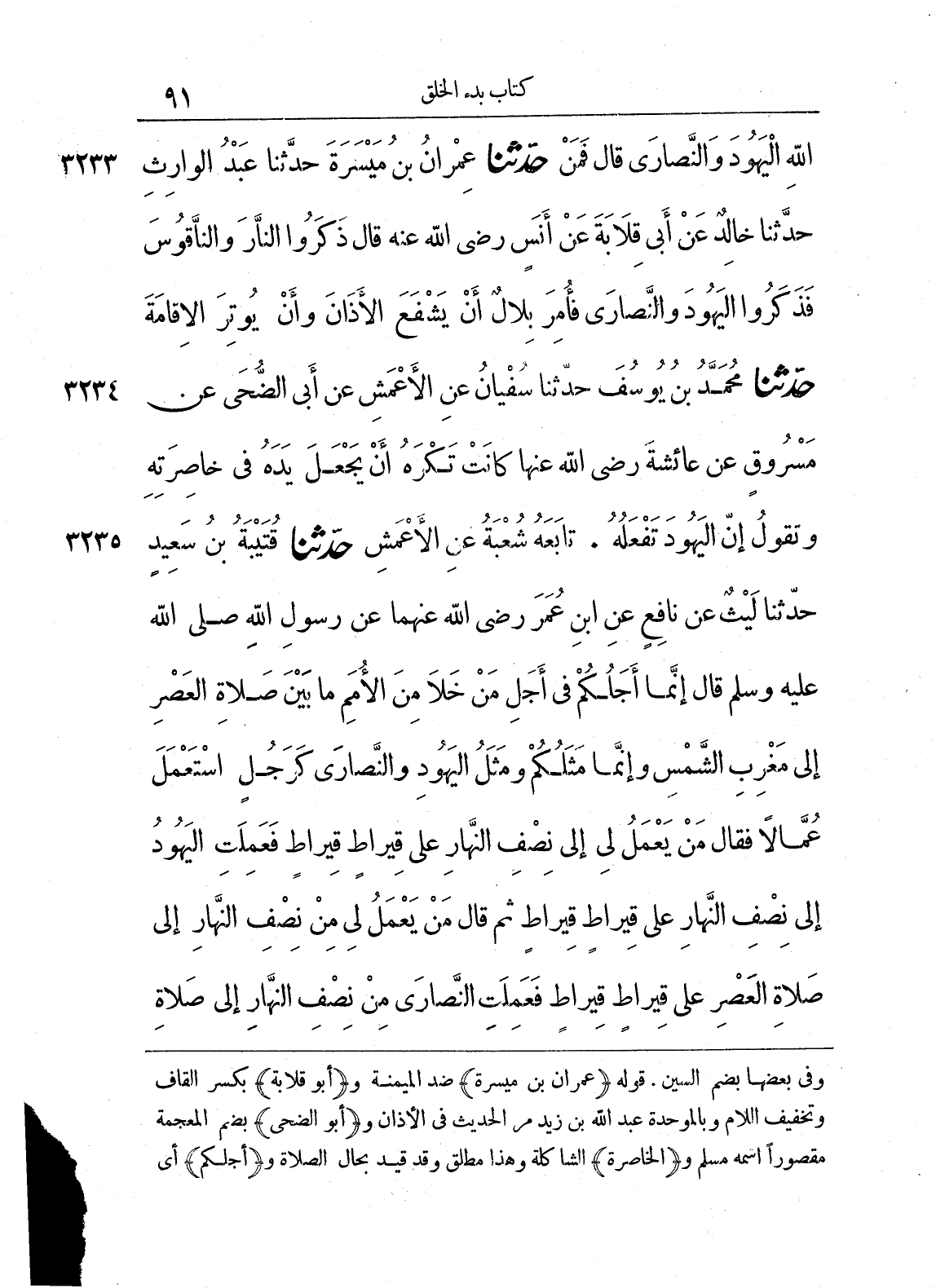3233 - حَدَّثَنَا عِمْرَانُ بْنُ مَيْسَرَةَ حَدَّثَنَا عَبْدُ الْوَارِثِ حَدَّثَنَا خَالِدٌ عَنْ أَبِى قِلاَبَةَ عَنْ أَنَسٍ - رضى الله عنه - قَالَ ذَكَرُوا النَّارَ وَالنَّاقُوسَ، فَذَكَرُوا الْيَهُودَ وَالنَّصَارَى، فَأُمِرَ بِلاَلٌ أَنْ يَشْفَعَ الأَذَانَ وَأَنْ يُوتِرَ الإِقَامَةَ.
