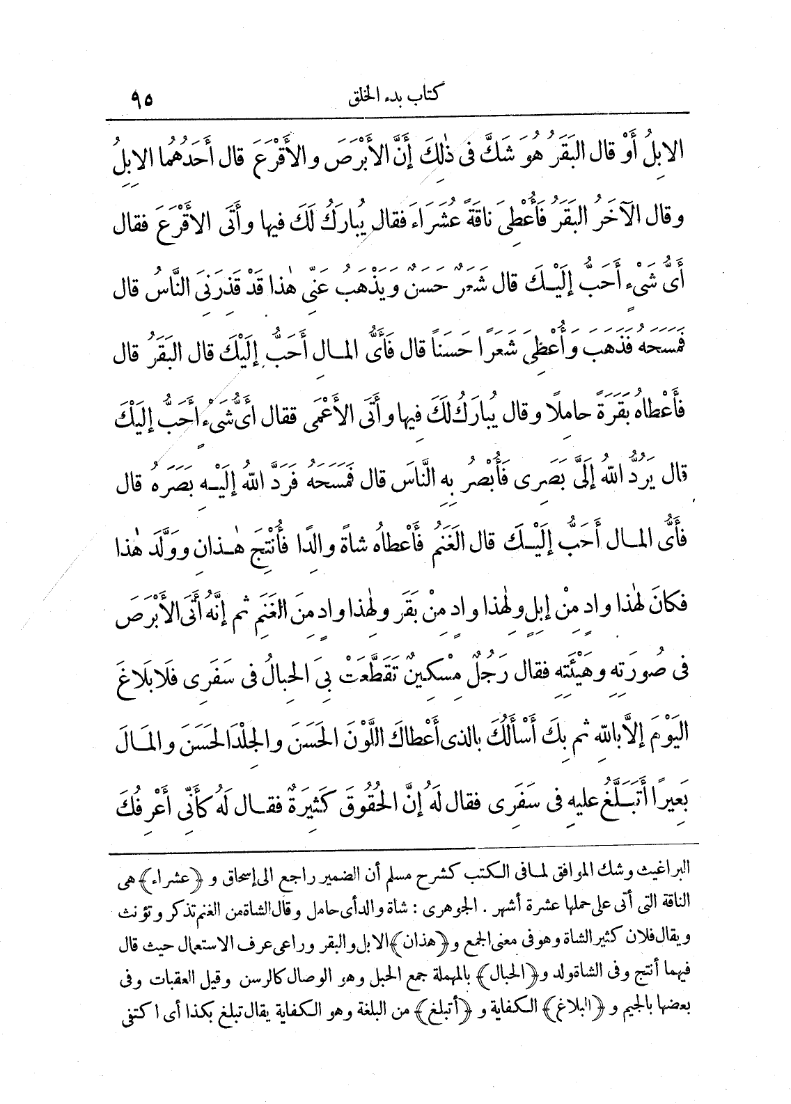 الإِبِلُ - أَوْ قَالَ الْبَقَرُ هُوَ شَكَّ فِى ذَلِكَ، إِنَّ الأَبْرَصَ وَالأَقْرَعَ، قَالَ أَحَدُهُمَا الإِبِلُ، وَقَالَ الآخَرُ الْبَقَرُ - فَأُعْطِىَ نَاقَةً عُشَرَاءَ. فَقَالَ يُبَارَكُ لَكَ فِيهَا. وَأَتَى الأَقْرَعَ فَقَالَ أَىُّ شَىْءٍ أَحَبُّ إِلَيْكَ قَالَ شَعَرٌ حَسَنٌ، وَيَذْهَبُ عَنِّى هَذَا، قَدْ قَذِرَنِى النَّاسُ. قَالَ فَمَسَحَهُ فَذَهَبَ، وَأُعْطِىَ شَعَراً حَسَناً. قَالَ فَأَىُّ الْمَالِ أَحَبُّ إِلَيْكَ قَالَ الْبَقَرُ. قَالَ فَأَعْطَاهُ بَقَرَةً حَامِلاً، وَقَالَ يُبَارَكُ لَكَ فِيهَا. وَأَتَى الأَعْمَى فَقَالَ أَىُّ شَىْءٍ أَحَبُّ إِلَيْكَ قَالَ يَرُدُّ اللَّهُ إِلَىَّ بَصَرِى، فَأُبْصِرُ بِهِ النَّاسَ. قَالَ فَمَسَحَهُ، فَرَدَّ اللَّهُ إِلَيْهِ بَصَرَهُ. قَالَ فَأَىُّ الْمَالِ أَحَبُّ إِلَيْكَ قَالَ الْغَنَمُ. فَأَعْطَاهُ شَاةً وَالِداً، فَأُنْتِجَ هَذَانِ، وَوَلَّدَ هَذَا، فَكَانَ لِهَذَا وَادٍ مِنْ إِبِلٍ، وَلِهَذَا وَادٍ مِنْ بَقَرٍ، وَلِهَذَا وَادٍ مِنَ الْغَنَمِ. ثُمَّ إِنَّهُ أَتَى الأَبْرَصَ فِى صُورَتِهِ وَهَيْئَتِهِ فَقَالَ رَجُلٌ مِسْكِينٌ، تَقَطَّعَتْ بِىَ الْحِبَالُ فِى سَفَرِى، فَلاَ بَلاَغَ الْيَوْمَ إِلاَّ بِاللَّهِ ثُمَّ بِكَ، أَسْأَلُكَ بِالَّذِى أَعْطَاكَ اللَّوْنَ الْحَسَنَ وَالْجِلْدَ الْحَسَنَ وَالْمَالَ بَعِيراً أَتَبَلَّغُ عَلَيْهِ فِى سَفَرِى. فَقَالَ لَهُ إِنَّ الْحُقُوقَ كَثِيرَةٌ. فَقَالَ لَهُ كَأَنِّى أَعْرِفُكَ