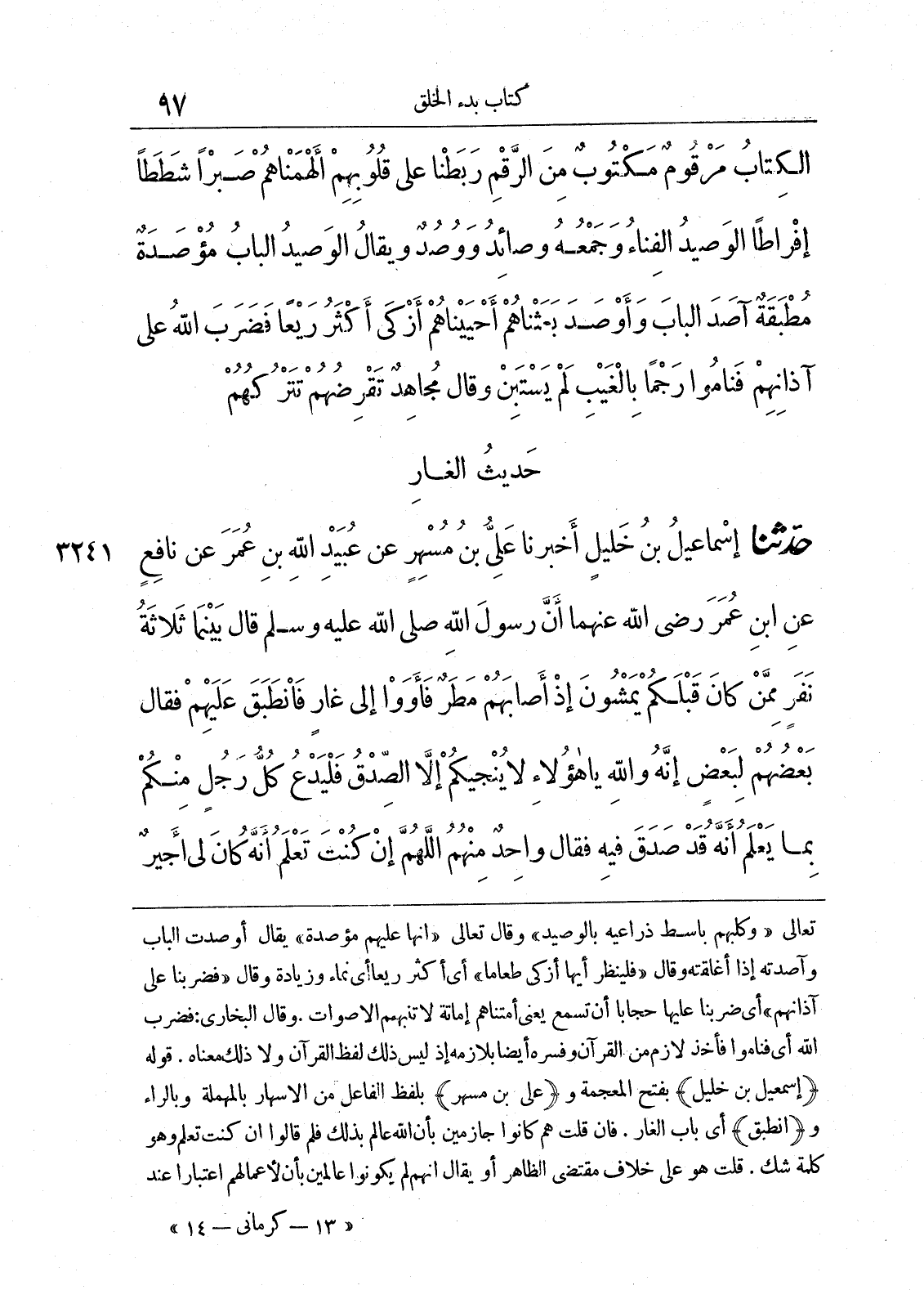 تعالى (وكلبهم باسطٌ ذراعيه بالوصيد) وقال تعالى: (إنها عليهم مؤصدة) يقال أوصدت الباب وآصدته إذا أغلقته وقال (فلينظر أيها أزكى طعاماً) أي أكثر ريعاً أي نماءً وزيادة وقال (فضربنا على آذانهم) أي ضربنا عليها حجاباً أن تسمع يعني أمتناهم إماتة لا تنبههم الأصوات. وقال البخاري: فضرب الله أي فناموا فأخذ لازم من القرآن وفسره أيضاً بلازمه إذ ليس ذلك لفظ القرآن ولا ذلك معناه. قوله (إسمعيل بن خليل) بفتح المعجمة و (علي بن مسهر) بلفظ الفاعل من الإسهار بالمهملة وبالراء وبالراء و (انطبق) أي باب الغار. فإن قلت هم كانوا جازمين بأن الله عالم بذلك فلم قالوا إن كنت تعلم وهو كلمة شك. قلت هو على خلاف مقتضى الظاهر أو يقال إنهم لم يكونوا عالمين بأن لأعمالهم اعتباراً عند