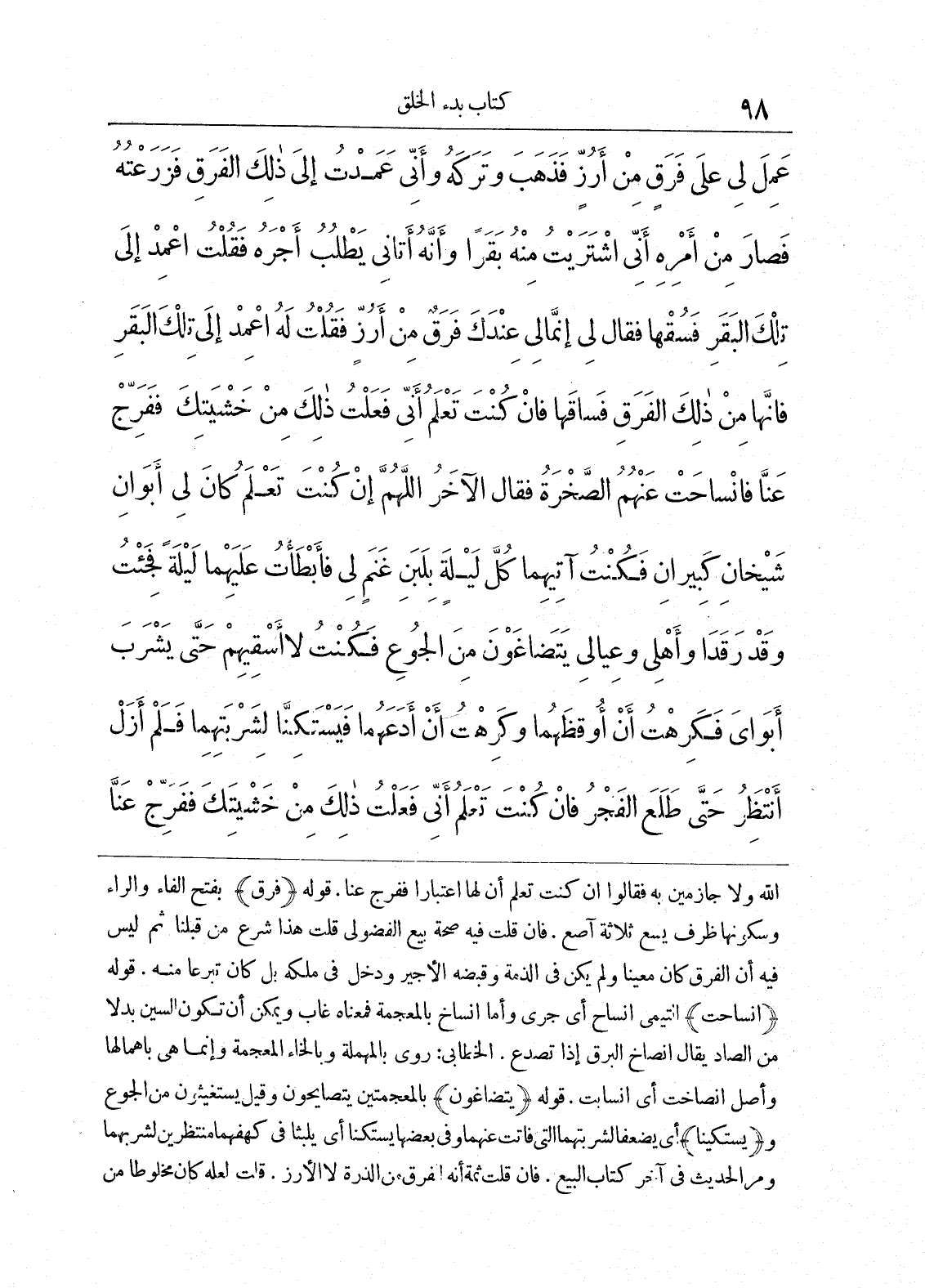 الله ولا جازمين به فقالوا إن كنت تعلم أن لها اعتباراً ففرج عنا. قوله (فرق) بفتح الفاء والراء وسكونها ظرف يسع ثلاثة آصع. فإن قلت فيه صحة بيع الفضولي قلت هذا شرع من قبلنا ثم ليس فيه أن الفرق كان معيناً ولم يكن في الذمة وقبضه الأجير ودخل في ملكه بل كان تبرعاً منه. قوله (انساحت) التيمي انساح أي جرى وأما انساخ بالمعجمة فمعناه غاب ويمكن أن تكون السين بدلاً من الصاد يقال انصاخ البرق إذا تصدع. الخطابي: روى بالمهملة وبالخاء المعجمة وإنما هي بإهمالها وأصل انصاخت أي انسابت. قوله (يتضاغون) بالمعجمتين يتصايحون وقيل يستغيثون من الجوع و (يستكينا) أي يضعفا لشربتهما التي فاتت عنهما وفي بعضها يستكنا أي يلبثا في كهفهما منتظرين لشربهما ومر الحديث في آخر كتاب البيع. فإن قلت ثمة أنه لفرق من الذرة لا الأرز. قلت لعله كان مخلوطاً من