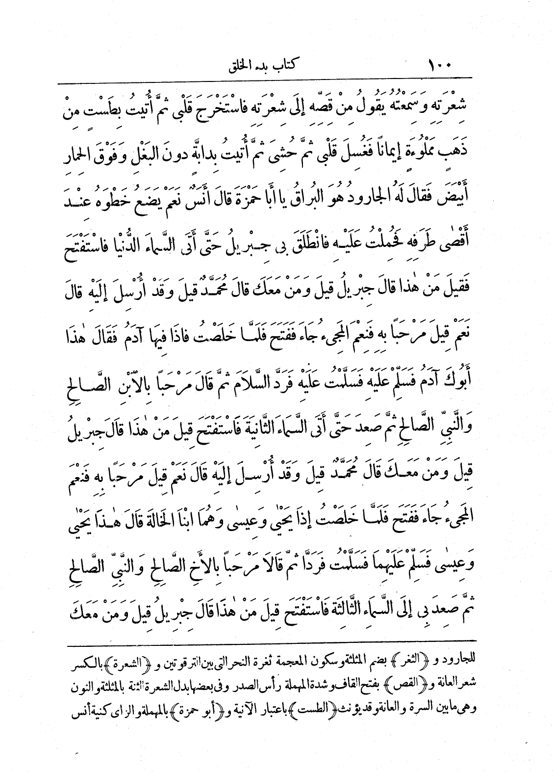 شِعْرَتِهِ وَسَمِعْتُهُ يَقُولُ مِنْ قَصِّهِ إِلَى شِعْرَتِهِ فَاسْتَخْرَجَ قَلْبِي ثُمَّ أُتِيتُ بِطَسْتٍ مِنْ ذَهَبٍ مَمْلُوءَةٍ إِيمَانًا فَغُسِلَ قَلْبِي ثُمَّ حُشِيَ ثُمَّ أُعِيدَ ثُمَّ أُتِيتُ بِدَابَّةٍ دُونَ الْبَغْلِ وَفَوْقَ الْحِمَارِ أَبْيَضَ فَقَالَ لَهُ الْجَارُودُ هُوَ الْبُرَاقُ يَا أَبَا حَمْزَةَ قَالَ أَنَسٌ نَعَمْ يَضَعُ خَطْوَهُ عِنْدَ أَقْصَى طَرْفِهِ فَحُمِلْتُ عَلَيْهِ فَانْطَلَقَ بِي جِبْرِيلُ حَتَّى أَتَى السَّمَاءَ الدُّنْيَا فَاسْتَفْتَحَ فَقِيلَ مَنْ هَذَا قَالَ جِبْرِيلُ قِيلَ وَمَنْ مَعَكَ قَالَ مُحَمَّدٌ قِيلَ وَقَدْ أُرْسِلَ إِلَيْهِ قَالَ نَعَمْ قِيلَ مَرْحَبًا بِهِ فَنِعْمَ الْمَجِيءُ جَاءَ فَفَتَحَ فَلَمَّا خَلَصْتُ فَإِذَا فِيهَا آدَمُ فَقَالَ هَذَا أَبُوكَ آدَمُ فَسَلِّمْ عَلَيْهِ فَسَلَّمْتُ عَلَيْهِ فَرَدَّ السَّلَامَ ثُمَّ قَالَ مَرْحَبًا بِالِابْنِ الصَّالِحِ وَالنَّبِيِّ الصَّالِحِ ثُمَّ صَعِدَ بِي حَتَّى أَتَى السَّمَاءَ الثَّانِيَةَ فَاسْتَفْتَحَ قِيلَ مَنْ هَذَا قَالَ جِبْرِيلُ قِيلَ وَمَنْ مَعَكَ قَالَ مُحَمَّدٌ قِيلَ وَقَدْ أُرْسِلَ إِلَيْهِ قَالَ نَعَمْ قِيلَ مَرْحَبًا بِهِ فَنِعْمَ الْمَجِيءُ جَاءَ فَفَتَحَ فَلَمَّا خَلَصْتُ إِذَا يَحْيَى وَعِيسَى وَهُمَا ابْنَا الْخَالَةِ قَالَ هَذَا يَحْيَى وَعِيسَى فَسَلِّمْ عَلَيْهِمَا فَسَلَّمْتُ فَرَدَّا ثُمَّ قَالَا مَرْحَبًا بِالْأَخِ الصَّالِحِ وَالنَّبِيِّ الصَّالِحِ ثُمَّ صَعِدَ بِي إِلَى السَّمَاءِ الثَّالِثَةِ فَاسْتَفْتَحَ قِيلَ مَنْ هَذَا قَالَ جِبْرِيلُ قِيلَ وَمَنْ مَعَكَ