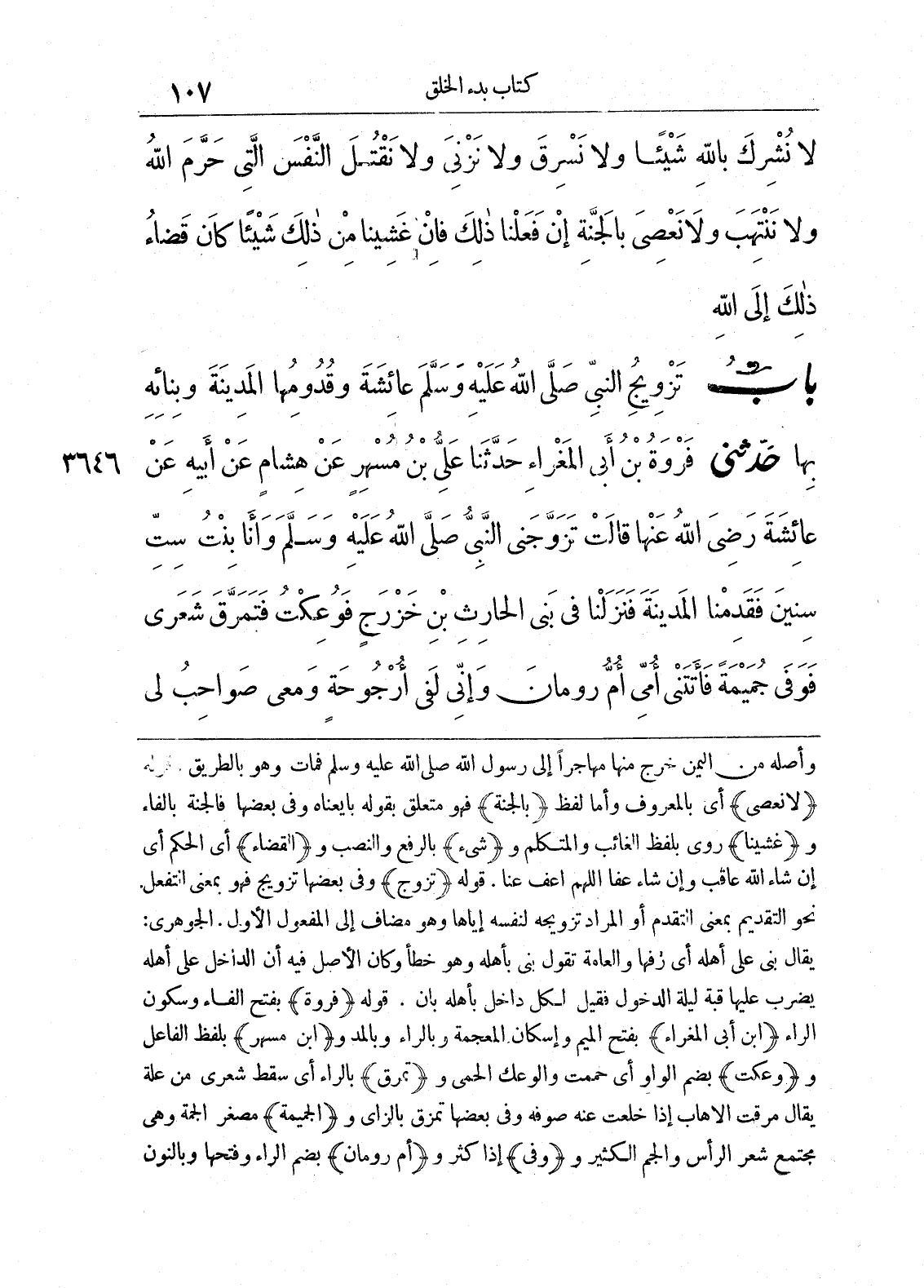 3646 - حَدَّثَنِي فَرْوَةُ بْنُ أَبِي الْمَغْرَاءِ حَدَّثَنَا عَلِيُّ بْنُ مُسْهِرٍ عَنْ هِشَامٍ عَنْ أَبِيهِ عَنْ عَائِشَةَ رَضِيَ اللَّهُ عَنْهَا قَالَتْ تَزَوَّجَنِي النَّبِيُّ صَلَّى اللَّهُ عَلَيْهِ وَسَلَّمَ وَأَنَا بِنْتُ سِتِّ سِنِينَ فَقَدِمْنَا الْمَدِينَةَ فَنَزَلْنَا فِي بَنِي الْحَارِثِ بْنِ خَزْرَجٍ فَوُعِكْتُ فَتَمَرَّقَ شَعَرِي فَوَفَى جُمَيْمَةً فَأَتَتْنِي أُمِّي أُمُّ رُومَانَ وَإِنِّي لَفِي أُرْجُوحَةٍ وَمَعِي صَوَاحِبُ لِي