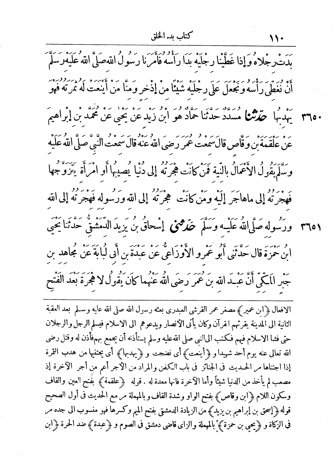 3650 - حَدَّثَنَا مُسَدَّدٌ حَدَّثَنَا حَمَّادٌ هُوَ ابْنُ زَيْدٍ عَنْ يَحْيَى عَنْ مُحَمَّدِ بْنِ إِبْرَاهِيمَ عَنْ عَلْقَمَةَ بْنِ وَقَّاصٍ قَالَ سَمِعْتُ عُمَرَ رَضِيَ اللَّهُ عَنْهُ قَالَ سَمِعْتُ النَّبِيَّ صَلَّى اللَّهُ عَلَيْهِ وَسَلَّمَ يَقُولُ الْأَعْمَالُ بِالنِّيَّةِ فَمَنْ كَانَتْ هِجْرَتُهُ إِلَى دُنْيَا يُصِيبُهَا أَوْ امْرَأَةٍ يَتَزَوَّجُهَا فَهِجْرَتُهُ إِلَى مَا هَاجَرَ إِلَيْهِ وَمَنْ كَانَتْ هِجْرَتُهُ إِلَى اللَّهِ وَرَسُولِهِ فَهِجْرَتُهُ إِلَى اللَّهِ وَرَسُولِهِ