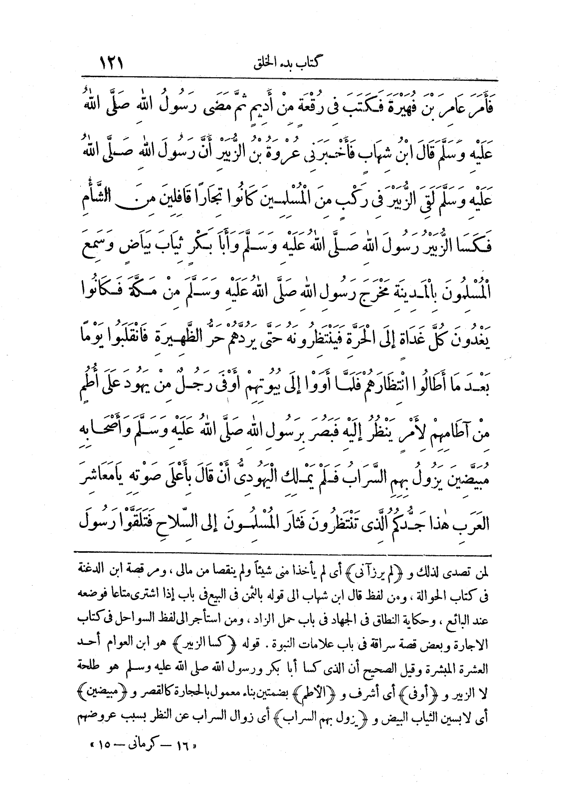 فَأَمَرَ عَامِرَ بْنَ فُهَيْرَةَ فَكَتَبَ فِي رُقْعَةٍ مِنْ أَدِيمٍ ثُمَّ مَضَى رَسُولُ اللَّهِ صَلَّى اللَّهُ عَلَيْهِ وَسَلَّمَ قَالَ ابْنُ شِهَابٍ فَأَخْبَرَنِي عُرْوَةُ بْنُ الزُّبَيْرِ أَنَّ رَسُولَ اللَّهِ صَلَّى اللَّهُ عَلَيْهِ وَسَلَّمَ لَقِيَ الزُّبَيْرَ فِي رَكْبٍ مِنْ الْمُسْلِمِينَ كَانُوا تِجَارًا قَافِلِينَ مِنْ الشَّامِ فَكَسَا الزُّبَيْرُ رَسُولَ اللَّهِ صَلَّى اللَّهُ عَلَيْهِ وَسَلَّمَ وَأَبَا بَكْرٍ ثِيَابَ بَيَاضٍ وَسَمِعَ الْمُسْلِمُونَ بِالْمَدِينَةِ مَخْرَجَ رَسُولِ اللَّهِ صَلَّى اللَّهُ عَلَيْهِ وَسَلَّمَ مِنْ مَكَّةَ فَكَانُوا يَغْدُونَ كُلَّ غَدَاةٍ إِلَى الْحَرَّةِ فَيَنْتَظِرُونَهُ حَتَّى يَرُدَّهُمْ حَرُّ الظَّهِيرَةِ فَانْقَلَبُوا يَوْمًا بَعْدَ مَا أَطَالُوا انْتِظَارَهُمْ فَلَمَّا أَوَوْا إِلَى بُيُوتِهِمْ أَوْفَى رَجُلٌ مِنْ يَهُودَ عَلَى أُطُمٍ مِنْ آطَامِهِمْ لِأَمْرٍ يَنْظُرُ إِلَيْهِ فَبَصُرَ بِرَسُولِ اللَّهِ صَلَّى اللَّهُ عَلَيْهِ وَسَلَّمَ وَأَصْحَابِهِ مُبَيَّضِينَ يَزُولُ بِهِمْ السَّرَابُ فَلَمْ يَمْلِكْ الْيَهُودِيُّ أَنْ قَالَ بِأَعْلَى صَوْتِهِ يَا مَعَاشِرَ الْعَرَبِ هَذَا جَدُّكُمْ الَّذِي تَنْتَظِرُونَ فَثَارَ الْمُسْلِمُونَ إِلَى السِّلَاحِ فَتَلَقَّوْا رَسُولَ