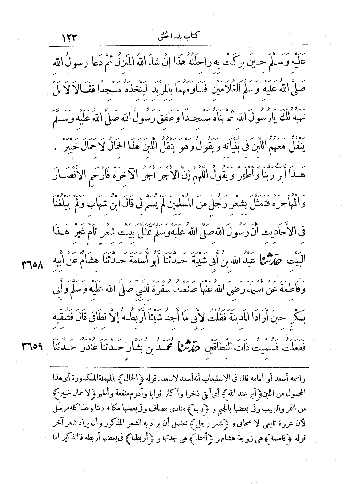 عَلَيْهِ وَسَلَّمَ حِينَ بَرَكَتْ بِهِ رَاحِلَتُهُ هَذَا إِنْ شَاءَ اللَّهُ الْمَنْزِلُ ثُمَّ دَعَا رَسُولُ اللَّهِ صَلَّى اللَّهُ عَلَيْهِ وَسَلَّمَ الْغُلَامَيْنِ فَسَاوَمَهُمَا بِالْمِرْبَدِ لِيَتَّخِذَهُ مَسْجِدًا فَقَالَا لَا بَلْ نَهَبُهُ لَكَ يَا رَسُولَ اللَّهِ فَأَبَى رَسُولُ اللَّهِ أَنْ يَقْبَلَهُ مِنْهُمَا هِبَةً حَتَّى ابْتَاعَهُ مِنْهُمَا ثُمَّ بَنَاهُ مَسْجِدًا وَطَفِقَ رَسُولُ اللَّهِ صَلَّى اللَّهُ عَلَيْهِ وَسَلَّمَ يَنْقُلُ مَعَهُمْ اللَّبِنَ فِي بُنْيَانِهِ وَيَقُولُ وَهُوَ يَنْقُلُ اللَّبِنَ هَذَا الْحِمَالُ لَا حِمَالَ خَيْبَرْ هَذَا أَبَرُّ رَبَّنَا وَأَطْهَرْ وَيَقُولُ اللَّهُمَّ إِنَّ الْأَجْرَ أَجْرُ الْآخِرَهْ فَارْحَمْ الْأَنْصَارَ وَالْمُهَاجِرَهْ فَتَمَثَّلَ بِشِعْرِ رَجُلٍ مِنْ الْمُسْلِمِينَ لَمْ يُسَمَّ لِي قَالَ ابْنُ شِهَابٍ وَلَمْ يَبْلُغْنَا فِي الْأَحَادِيثِ أَنَّ رَسُولَ اللَّهِ صَلَّى اللَّهُ عَلَيْهِ وَسَلَّمَ تَمَثَّلَ بِبَيْتِ شِعْرٍ تَامٍّ غَيْرَ هَذَا الْبَيْتِ