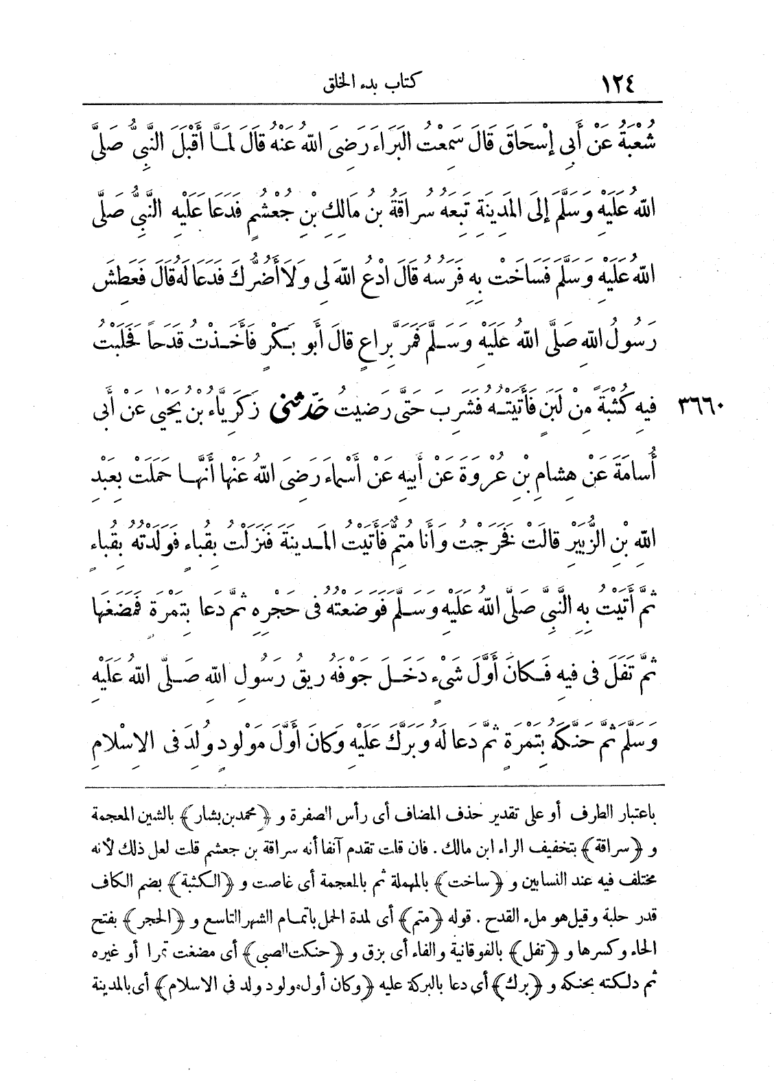 باعتبار الطرف أو على تقدير حذف المضاف أي رأس الصفرة و (محمد بن بشار) بالشين المعجمة و (سراقة) بتخفيف الراء ابن مالك. فإن قلت تقدم آنفا أنه سراقة بن جعشم قلت لعل ذلك لأنه مختلف فيه عند النسابين و (ساخت) بالمهملة ثم بالمعجمة أي غاضت و (الكثبة) بضم الكاف قدر حلبة وقيل هو ملء القدح. قوله (متم) أي لمدة الحمل بإتمام الشهر التاسع و (الحجر) بفتح الحاء وكسرها و (تفل) بالفوقانية والفاء أي بزق و (حنكت الصبي) أي مضغت تمرا أو غيره ثم دلكته بحنكه و (برك) أي دعا بالبركة عليه (وكان أول مولود ولد في الإسلام) أي بالمدينة