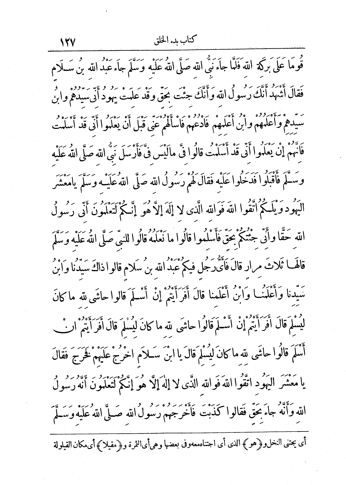 قُومَا عَلَى بَرَكَةِ اللَّهِ فَلَمَّا جَاءَ نَبِيُّ اللَّهِ صَلَّى اللَّهُ عَلَيْهِ وَسَلَّمَ جَاءَ عَبْدُ اللَّهِ بْنُ سَلَامٍ فَقَالَ أَشْهَدُ أَنَّكَ رَسُولُ اللَّهِ وَأَنَّكَ جِئْتَ بِحَقٍّ وَقَدْ عَلِمَتْ يَهُودُ أَنِّي سَيِّدُهُمْ وَابْنُ سَيِّدِهِمْ وَأَعْلَمُهُمْ وَابْنُ أَعْلَمِهِمْ فَادْعُهُمْ فَاسْأَلْهُمْ عَنِّي قَبْلَ أَنْ يَعْلَمُوا أَنِّي قَدْ أَسْلَمْتُ فَإِنَّهُمْ إِنْ يَعْلَمُوا أَنِّي قَدْ أَسْلَمْتُ قَالُوا فِيَّ مَا لَيْسَ فِيَّ فَأَرْسَلَ نَبِيُّ اللَّهِ صَلَّى اللَّهُ عَلَيْهِ وَسَلَّمَ فَأَقْبَلُوا فَدَخَلُوا عَلَيْهِ فَقَالَ لَهُمْ رَسُولُ اللَّهِ صَلَّى اللَّهُ عَلَيْهِ وَسَلَّمَ يَا مَعْشَرَ الْيَهُودِ وَيْلَكُمْ اتَّقُوا اللَّهَ فَوَاللَّهِ الَّذِي لَا إِلَهَ إِلَّا هُوَ إِنَّكُمْ لَتَعْلَمُونَ أَنِّي رَسُولُ اللَّهِ حَقًّا وَأَنِّي جِئْتُكُمْ بِحَقٍّ فَأَسْلِمُوا قَالُوا مَا نَعْلَمُهُ قَالُوا لِلنَّبِيِّ صَلَّى اللَّهُ عَلَيْهِ وَسَلَّمَ قَالَهَا ثَلَاثَ مِرَارٍ قَالَ فَأَيُّ رَجُلٍ فِيكُمْ عَبْدُ اللَّهِ بْنُ سَلَامٍ قَالُوا ذَاكَ سَيِّدُنَا وَابْنُ سَيِّدِنَا وَأَعْلَمُنَا وَابْنُ أَعْلَمِنَا قَالَ أَفَرَأَيْتُمْ إِنْ أَسْلَمَ قَالُوا حَاشَى لِلَّهِ مَا كَانَ لِيُسْلِمَ قَالَ أَفَرَأَيْتُمْ إِنْ أَسْلَمَ قَالُوا حَاشَى لِلَّهِ مَا كَانَ لِيُسْلِمَ قَالَ أَفَرَأَيْتُمْ إِنْ أَسْلَمَ قَالُوا حَاشَى لِلَّهِ مَا كَانَ لِيُسْلِمَ قَالَ يَا ابْنَ سَلَامٍ اخْرُجْ عَلَيْهِمْ فَخَرَجَ فَقَالَ يَا مَعْشَرَ الْيَهُودِ اتَّقُوا اللَّهَ فَوَاللَّهِ الَّذِي لَا إِلَهَ إِلَّا هُوَ إِنَّكُمْ لَتَعْلَمُونَ أَنَّهُ رَسُولُ اللَّهِ وَأَنَّهُ جَاءَ بِحَقٍّ فَقَالُوا كَذَبْتَ فَأَخْرَجَهُمْ رَسُولُ اللَّهِ صَلَّى اللَّهُ عَلَيْهِ وَسَلَّمَ