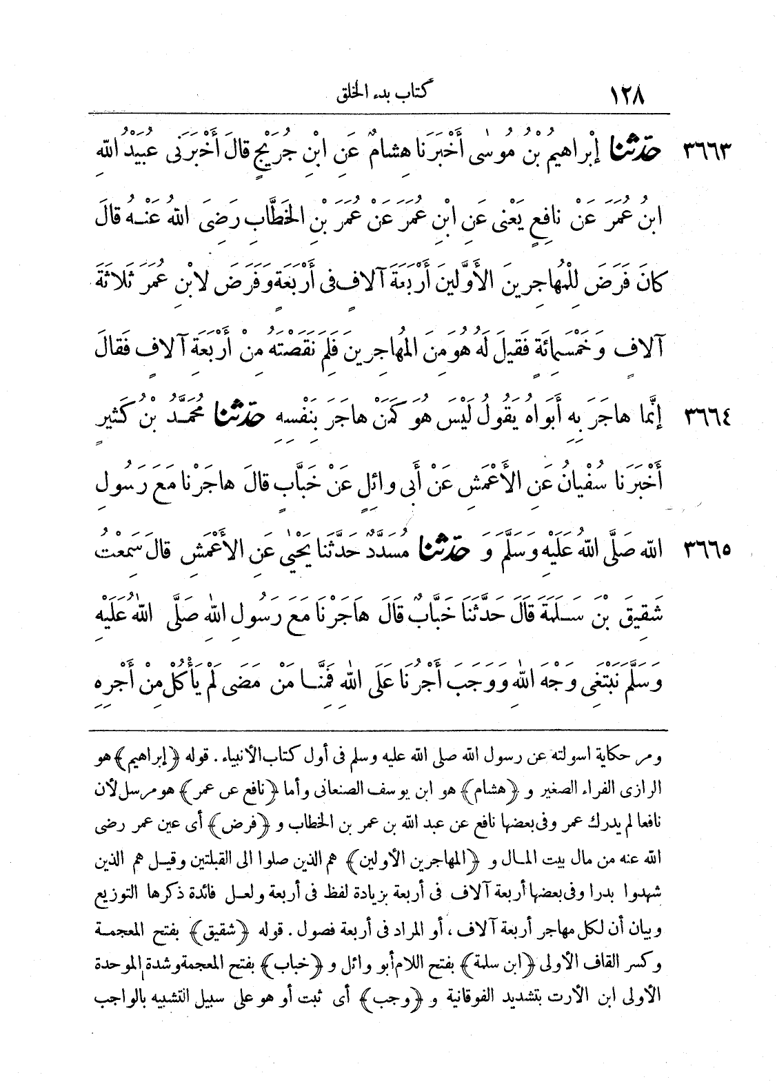 3663 - حَدَّثَنَا إِبْرَاهِيمُ بْنُ مُوسَى أَخْبَرَنَا هِشَامٌ عَنْ ابْنِ جُرَيْجٍ قَالَ أَخْبَرَنِي عُبَيْدُ اللَّهِ بْنُ عُمَرَ عَنْ نَافِعٍ عَنْ عُمَرَ بْنِ الْخَطَّابِ رَضِيَ اللَّهُ عَنْهُ قَالَ كَانَ فَرَضَ لِلْمُهَاجِرِينَ الْأَوَّلِينَ أَرْبَعَةَ آلَافٍ فِي أَرْبَعَةٍ وَفَرَضَ لِابْنِ عُمَرَ ثَلَاثَةَ آلَافٍ وَخَمْسَ مِائَةٍ فَقِيلَ لَهُ هُوَ مِنْ الْمُهَاجِرِينَ فَلِمَ نَقَصْتَهُ مِنْ أَرْبَعَةِ آلَافٍ فَقَالَ إِنَّمَا هَاجَرَ بِهِ أَبَوَاهُ يَقُولُ لَيْسَ هُوَ كَمَنْ هَاجَرَ بِنَفْسِهِ