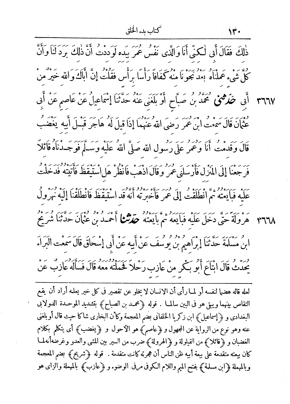 3667 - حَدَّثَنِي مُحَمَّدُ بْنُ صَبَّاحٍ أَوْ بَلَغَنِي عَنْهُ حَدَّثَنَا إِسْمَاعِيلُ عَنْ عَاصِمٍ عَنْ أَبِي عُثْمَانَ قَالَ سَمِعْتُ ابْنَ عُمَرَ رَضِيَ اللَّهُ عَنْهُمَا إِذَا قِيلَ لَهُ هَاجَرَ قَبْلَ أَبِيهِ يَغْضَبُ قَالَ وَقَدِمْتُ أَنَا وَعُمَرُ عَلَى رَسُولِ اللَّهِ صَلَّى اللَّهُ عَلَيْهِ وَسَلَّمَ فَوَجَدْنَاهُ قَائِلًا فَرَجَعْنَا إِلَى الْمَنْزِلِ فَأَرْسَلَنِي عُمَرُ وَقَالَ اذْهَبْ فَانْظُرْ هَلْ اسْتَيْقَظَ فَأَتَيْتُهُ فَدَخَلْتُ عَلَيْهِ فَبَايَعْتُهُ ثُمَّ انْطَلَقْتُ إِلَى عُمَرَ فَأَخْبَرْتُهُ أَنَّهُ قَدْ اسْتَيْقَظَ فَانْطَلَقْنَا إِلَيْهِ نُهَرْوِلُ هَرْوَلَةً حَتَّى دَخَلَ عَلَيْهِ فَبَايَعَهُ ثُمَّ بَايَعْتُهُ